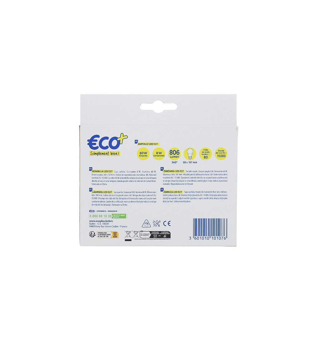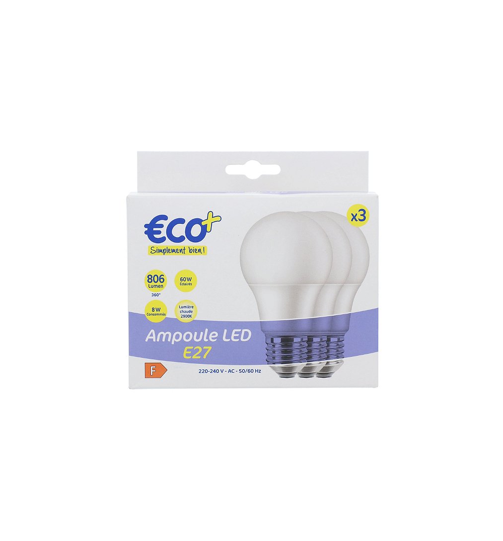 | Libellé | Lot de 3 ampoules LED standard opaque E27 60W lumière chaude - Eco+ |