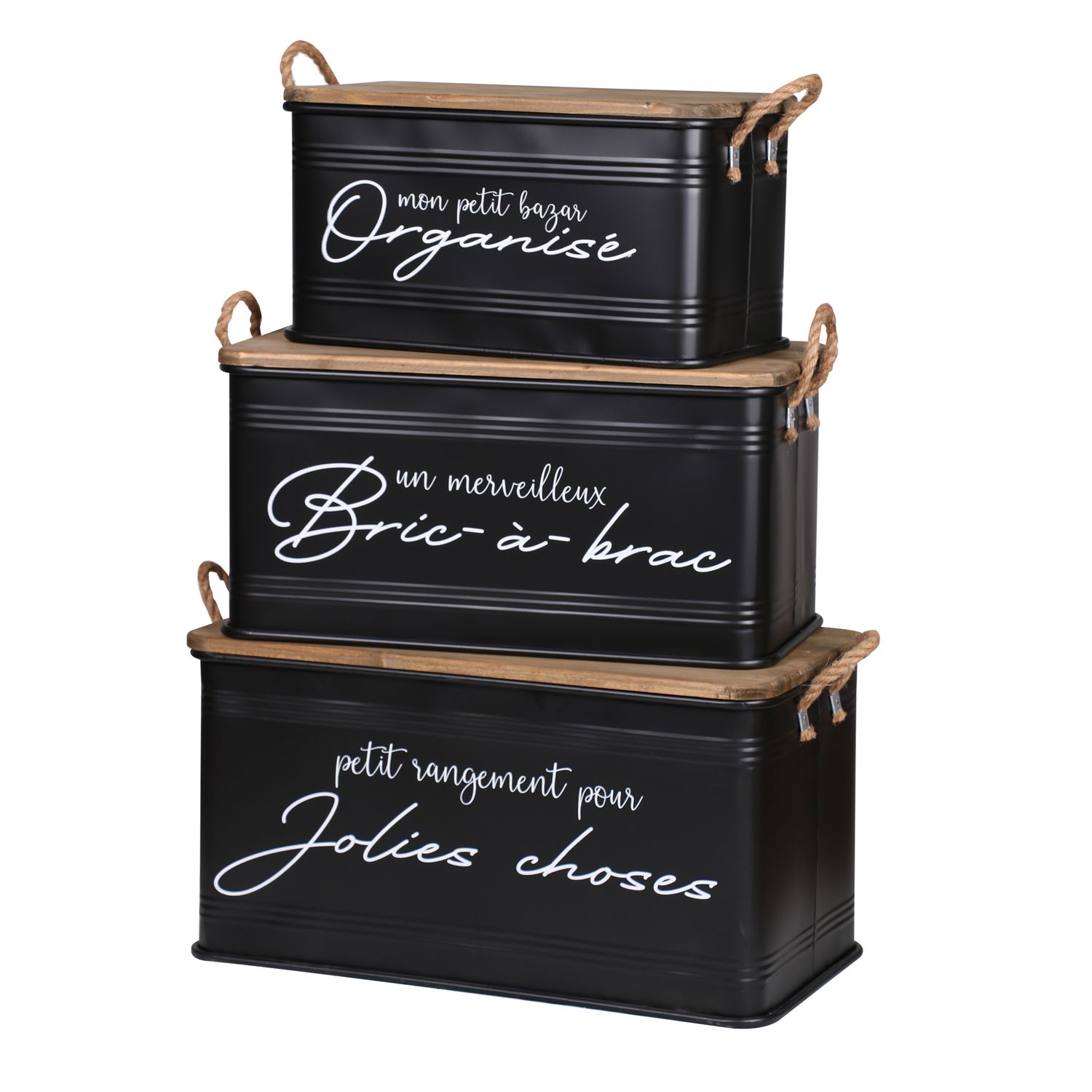 | Libellé | Lot de 3 boites de rangement en métal - Noir et bois |