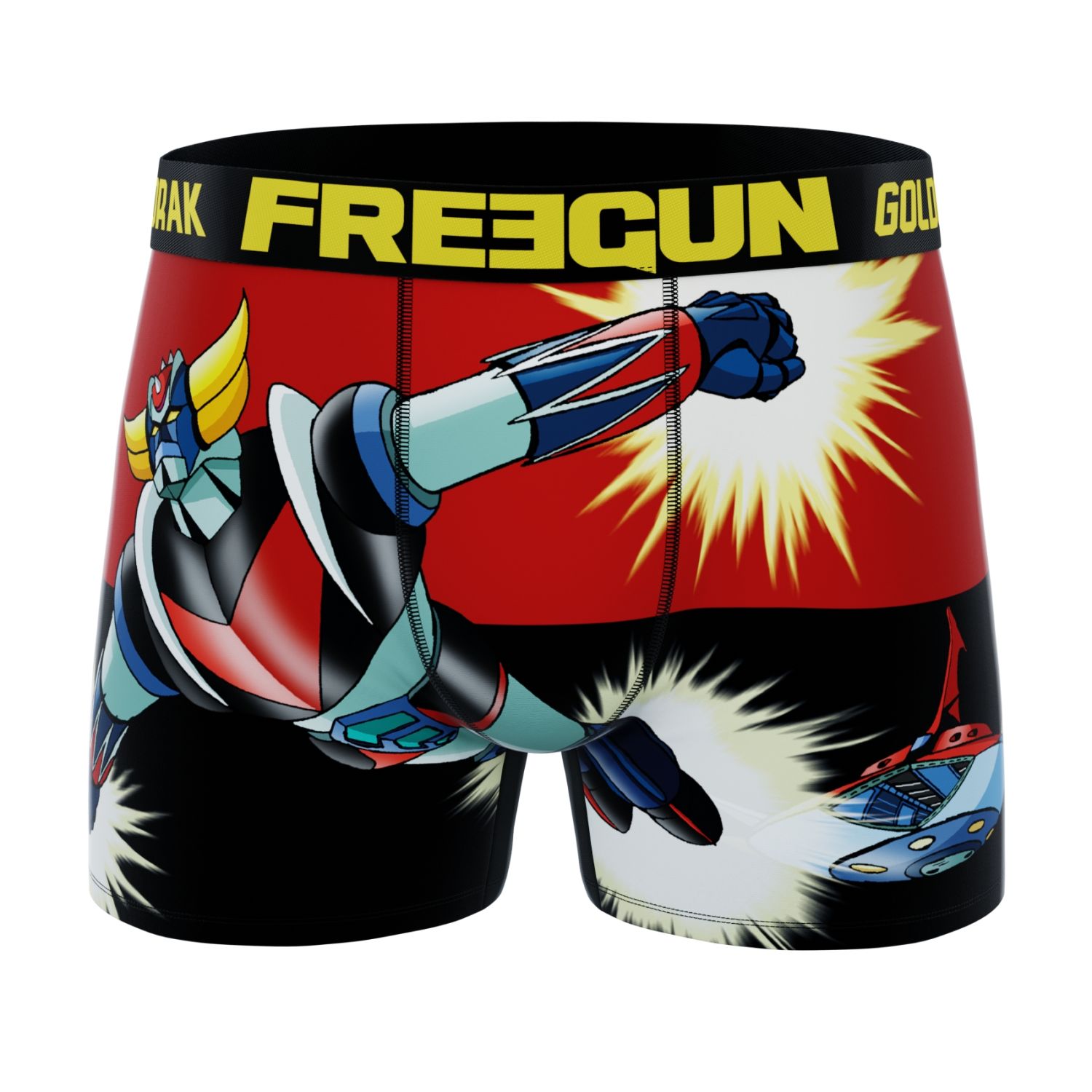 Nos caleçons Freegun Homme Imprimé Goldorak sont réalisés à base de 92% Polyester 8% Elasthanne - Doublure 100% Coton pour un maintien optimal, une liberté de mouvement incomparable dû à l'elasticité que contient le tissu du sous-vêtement et bien sur un confort à toute épreuve grâce à la douceur du textile microfibre et à la doublure en coton présente à l'interieur du slip Freegun. Les sous-vêtements Freegun Goldorak sont Confort,Respirant , la ceinture élastique Large Noir permet une tenue accrue sans gêne. Dans ce pack de boxers nous vous proposons différents coloris : Rouge, Gris, Bleu, Noir. Si vous êtes un passionné de Goldorak, n'hésitez pas à adopter un style décalé et fun ! Ce lot de boxers Freegun est lavable en machine à 30°C et resistera à la décoloration. Les imprimés Freegun sont dessinés en France, nos équipes graphistes recherchent sans cesse de nouveaux design inédits à arborer sur nos calecons. Ces sous-vêtements Freegun sont disponibles en taille S, M, L, XL, XXL, conformément aux standards de tailles européennes. Ne pas sécher au sèche linge, ne pas repasser.