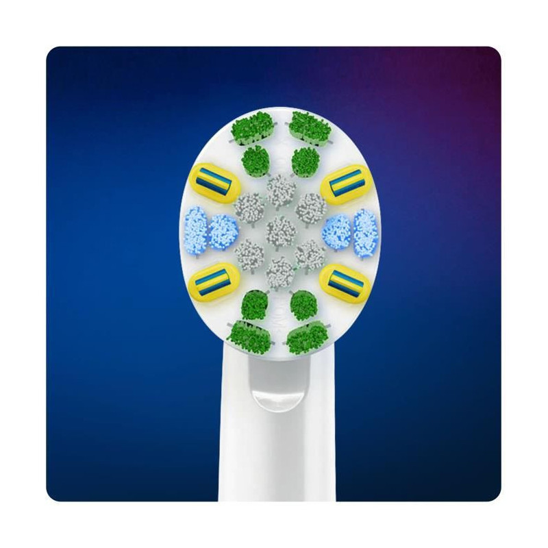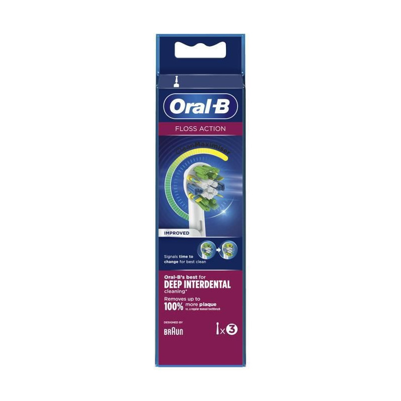 Passer le carrousel d'imagesEB25X3FLOSSACTION - lot de 3 brossettes pour brosses à dents électriques - La brossette de rechange Oral-B Clean Max EB25X3FLOSSACTION de Braun offre un nettoyage complet et supérieur à celui d'une brosse à dents manuelle classique. Ses poils nettoient la surface de chaque dent tandis que ses poils MicroPulse uniques pénètrent en profondeur dans les espaces interdentaires pour retirer plus de plaque dentaire qu'une brosse à dents manuelle classique. Les poils MicroPulse pivotent pour pénétrer en profondeur et nettoyer le long des gencives. Grâce à la technologie CleanMaximiser, les brins verts deviennent jaunes quand il est temps de changer la brossette. - Type de produit : Brossettes pour brosses à dents électriques.