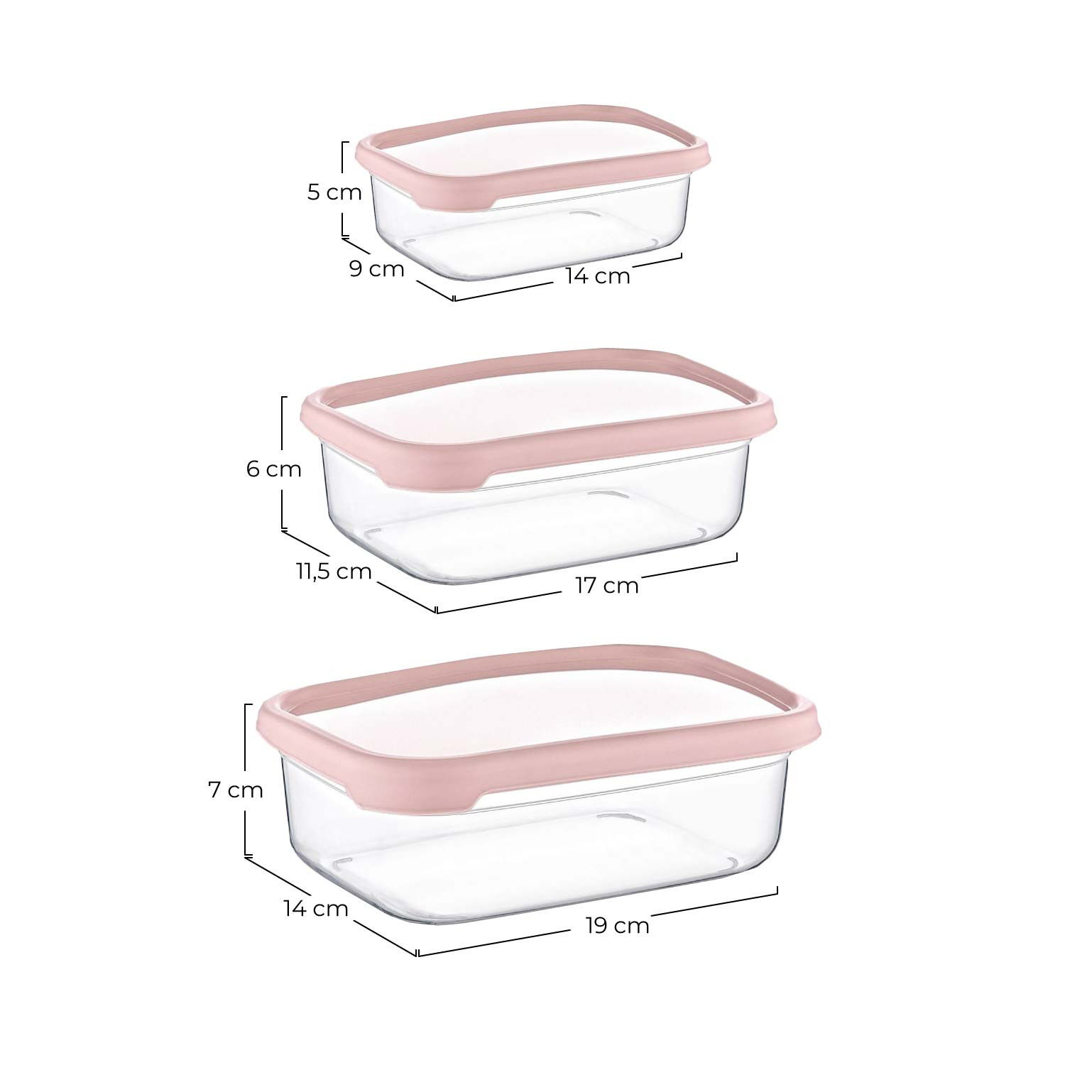 Fabriqué dans une combinaison de plastique PP et de polypropylène transparent pour que vous puissiez facilement voir ce qu'il y a à l'intérieur. Ces tupperware répondent à toutes les normes de qualité. Ils ne contiennent pas de substances nocives et sont exempts de BPA. Empilable, de forme rectangulaire. Leurs couvercles sont hermétiques et offrent donc une étanchéité sans gouttes. Ils isolent les odeurs et permettent de transporter les aliments sans risque de déversement. Disponible avec un couvercle rose, vert ou gris.