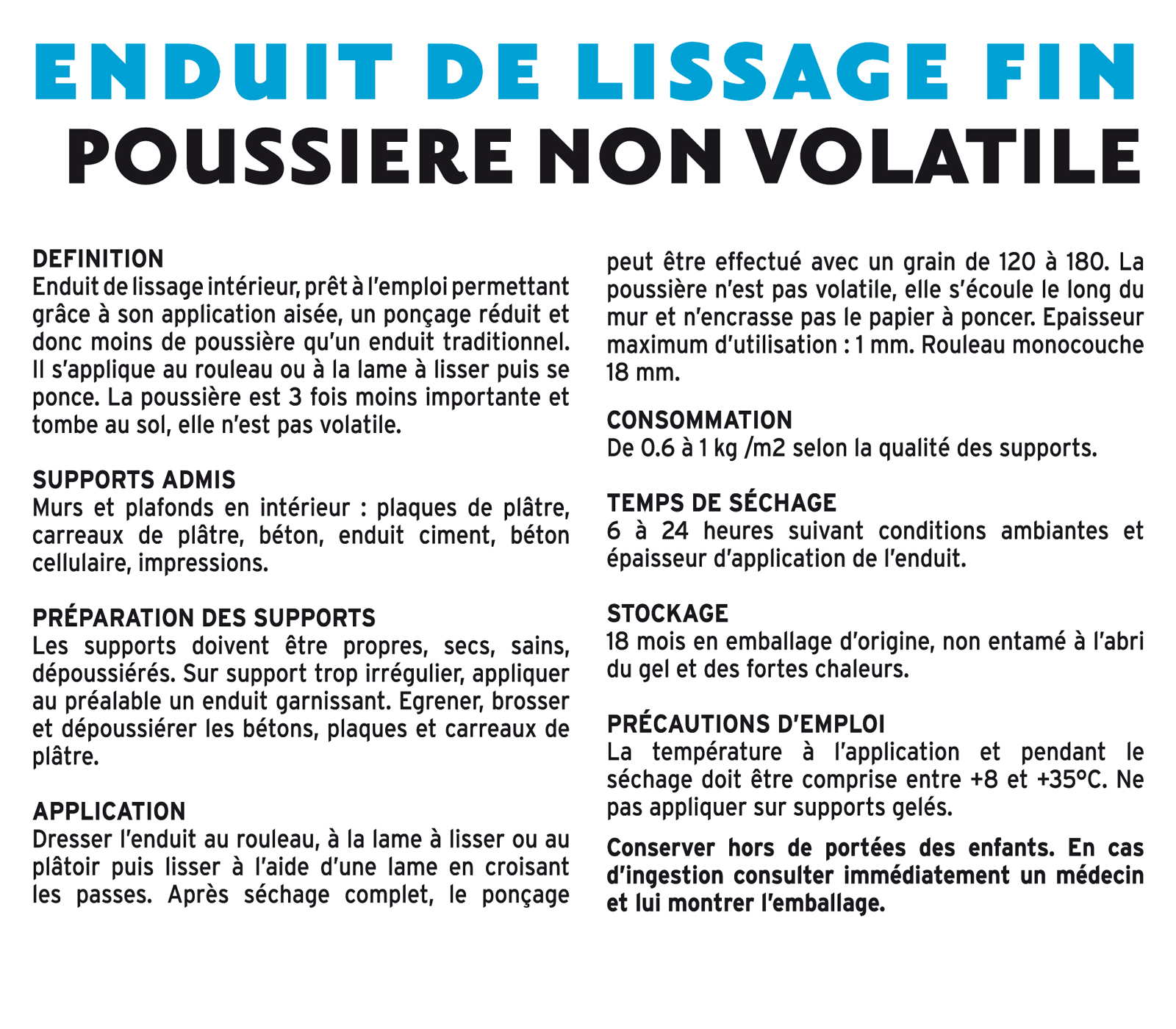 Enduit de lissage intérieur prêt à l’emploi de 10 kg permettant un ponçage réduit et donc moins de poussière qu’un enduit traditionnel.