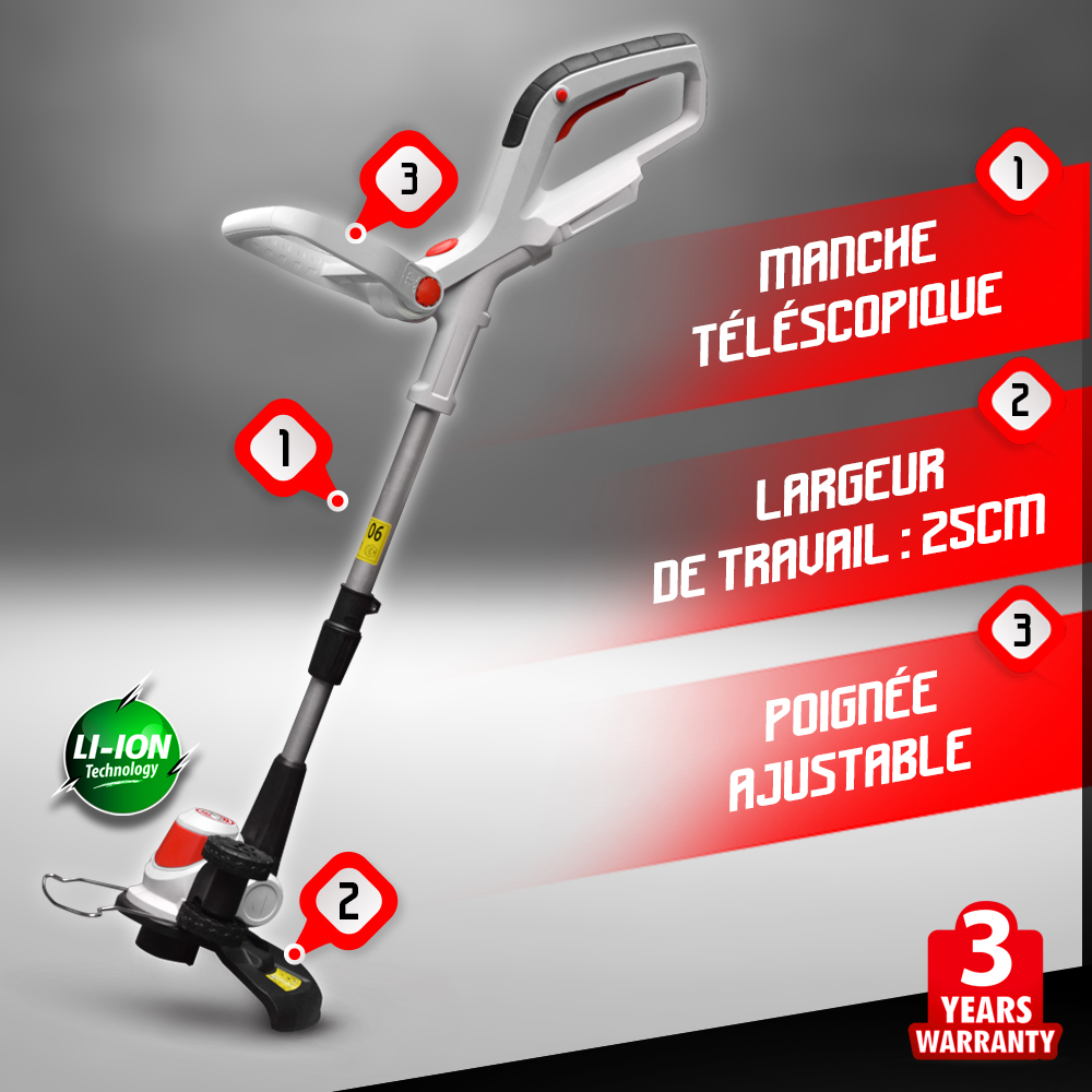Kit 3 machines pour l'entretien de votre jardin, elles sont alimentées par une batterie lithium 20V max de 2Ah. Composition du kit: une tondeuse, un coupe bordures, un souffleur, 1 chargeur rapide 1H et deux batteries 20V max 2Ah. Caractéristiques techniques: 1) Tondeuse 20V max équipée d'un moteur à induction - Largeur de coupe: 33cm - Réglage hauteur de coupe centralisé 5 positions (25-75mm) - Bac récolteur de 30L - Fonction mulching - Légère, maniable et silencieuse - Poignée de transport intégrée 2) Coupe bordures 20V max - Largeur de coupe: 25cm - Manche téléscopique en aluminium - Tête de coupe orientable - Roulette de guidage pour faciliter le travail en fonction dresse bordures - Réglage de la 2ème poignée de maintien pour un plus grand confort d'utilisation 3) Souffleur 20V max - Vitesse de la soufflerie: 150km/h - Débit d'air: 3.47 m³/min Livré avec un chargeur rapide 1H et deux batteries 20V max 2Ah