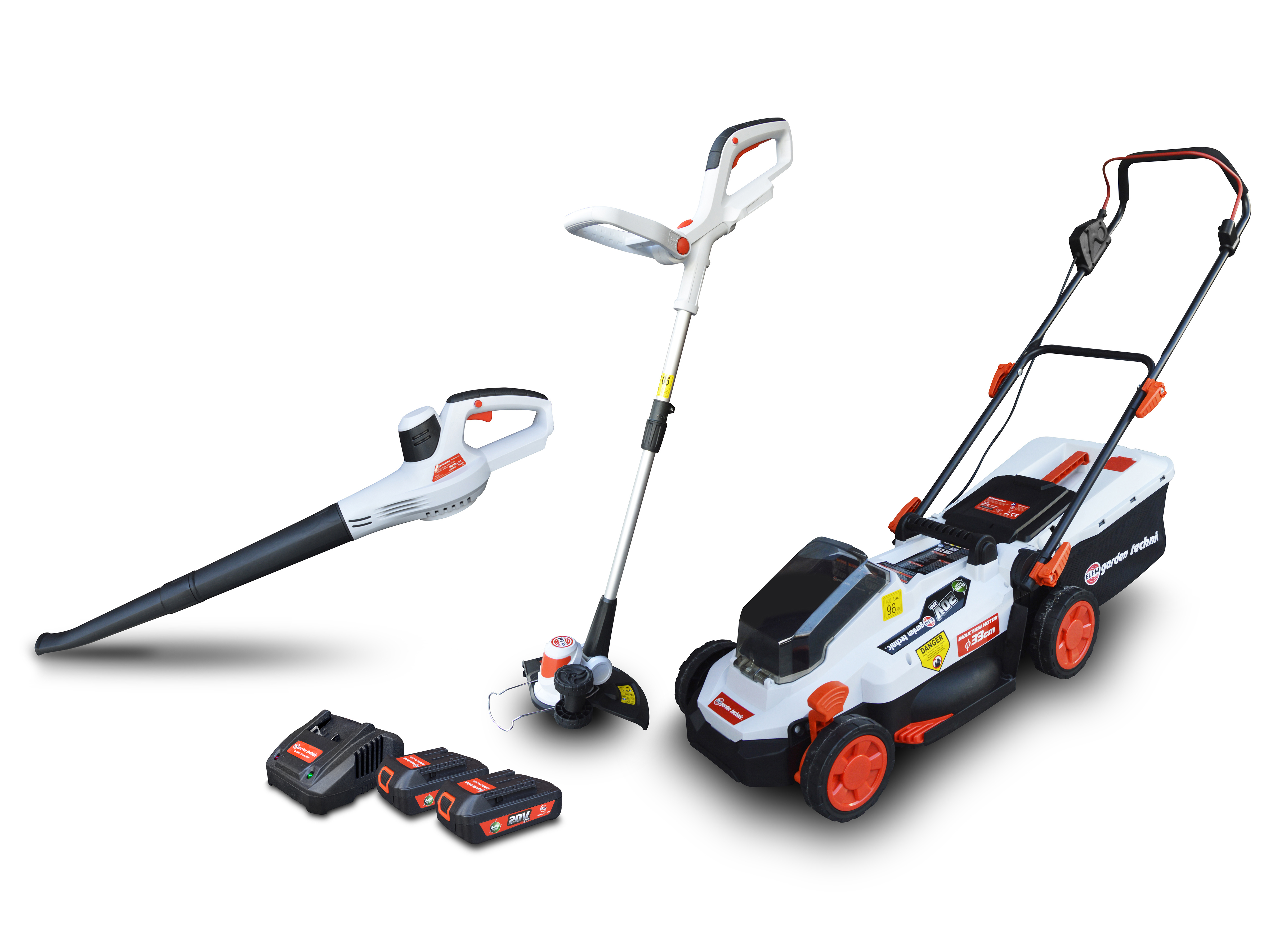 Lot de 3 machines rechargeables 20V - TCB20V-2XLI2AF - Elem Garden - Tondeuse + coupe bordures + souffleu