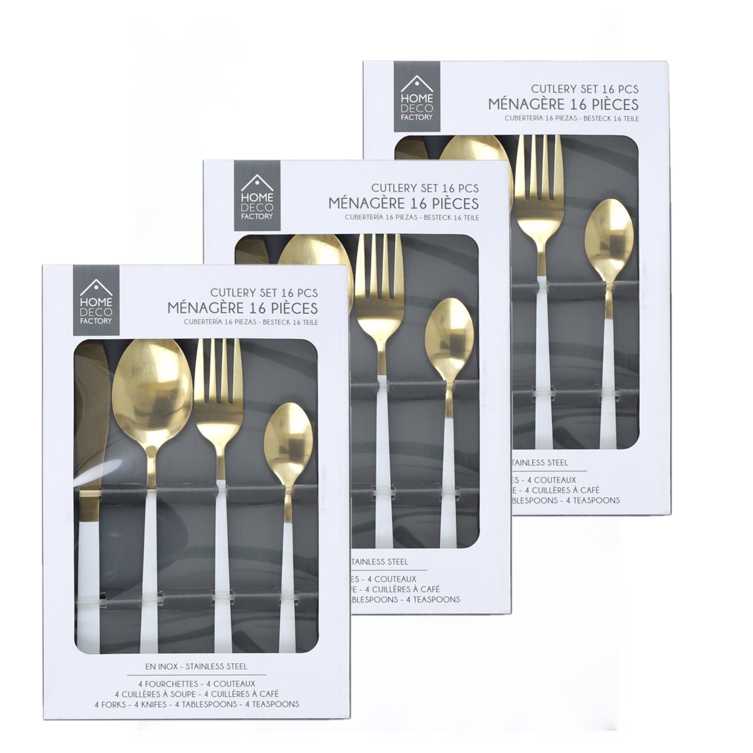 Ce lot de 3 jolies ménagères, chacune de 16 couverts doré et blanc, sera du plus bel effet sur vos tablées. Elle contient : 12 fourchettes, 12 couteaux, 12 cuillères à soupe et 12 cuillères à café.