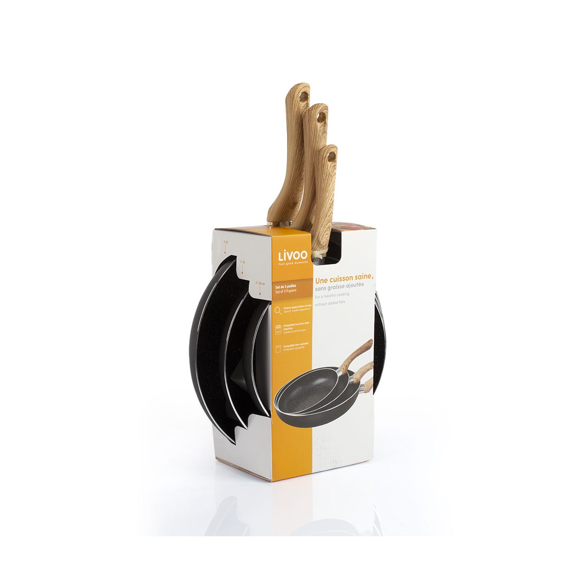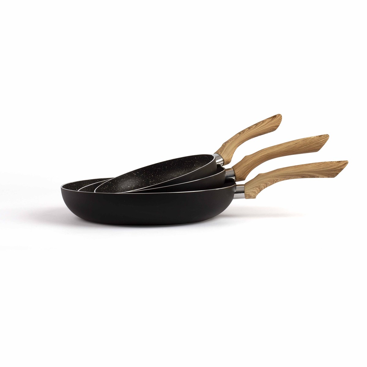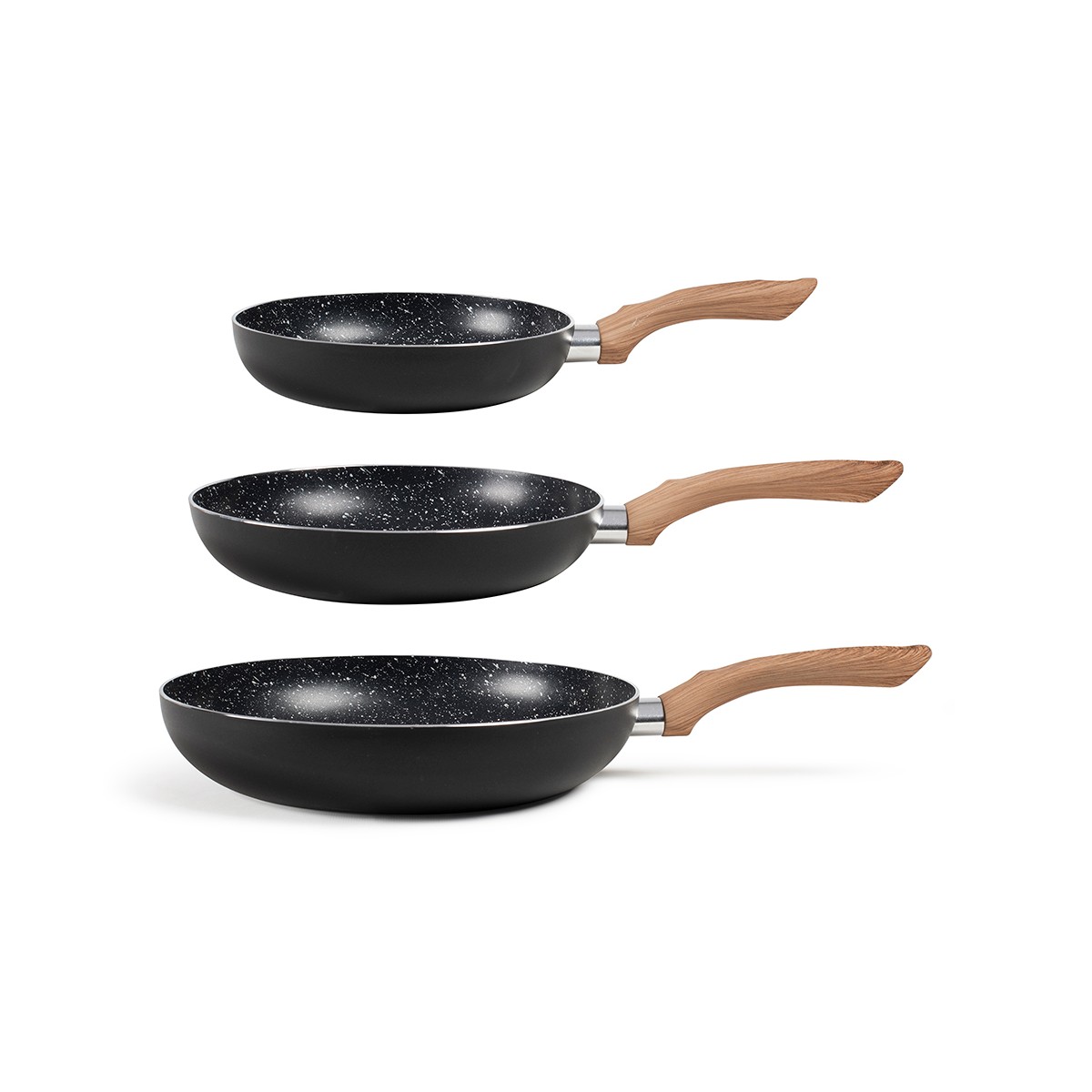 mep114 - lot de 3 poêles anti-adhérente 20/24/28cm - Set de 3 poêles Kitchen Artist MEP114 sont dotées de revêtement intérieur antiadhésif finition aspect pierre, manche revêtement silicone aspect bois, et cuisson sans ajout de matière grasse. - Type : Poêle