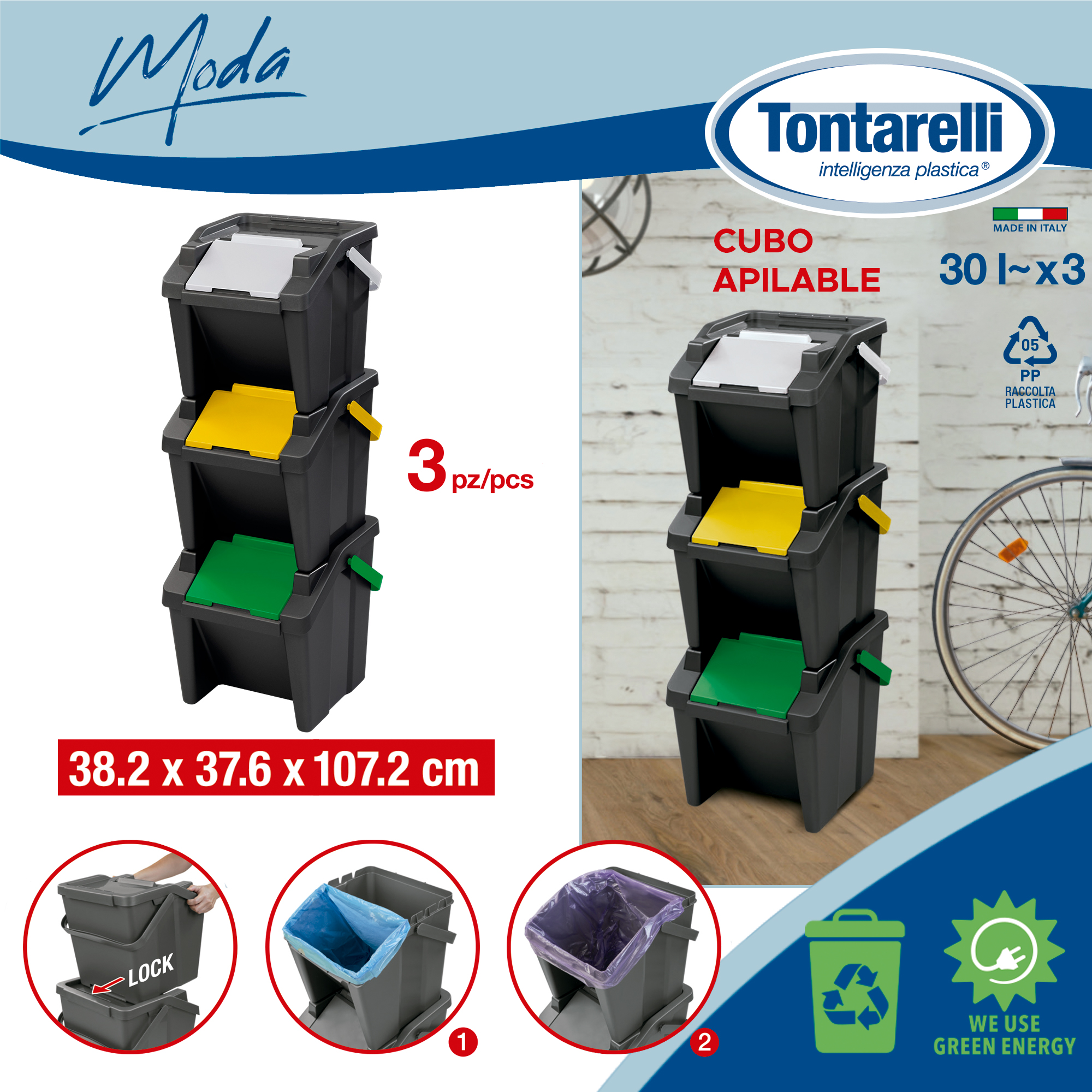 3UDS-Puqueble Paper "mode" 30L avec ASA Mesures: 38,2x37.6x37-107cm Couleur: noir avec couvercles verts, blancs et ambre Capacité: 3x30L