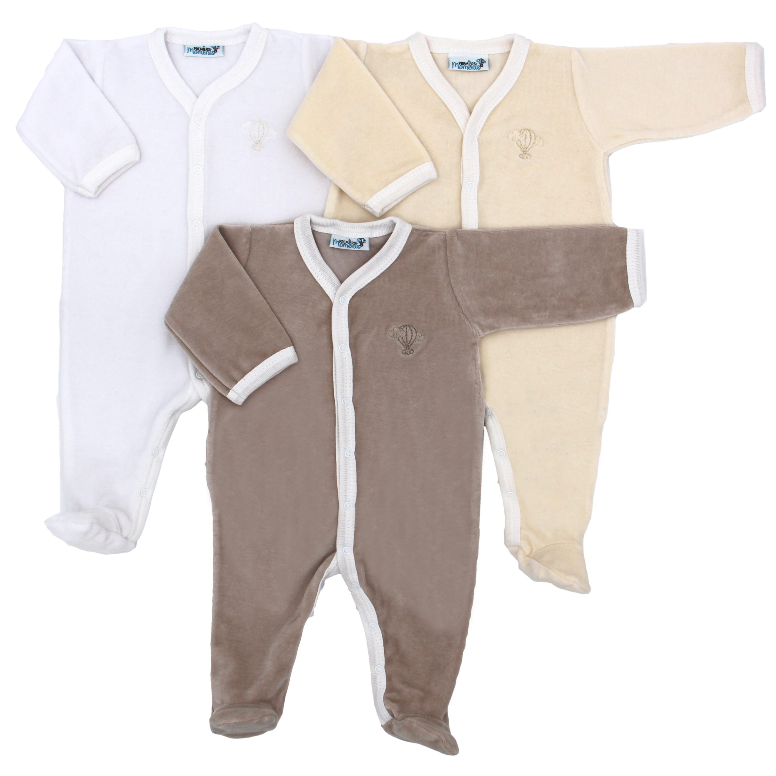 Lot de 3 pyjamas velours 100 % coton biologique - 1 à 6 mois