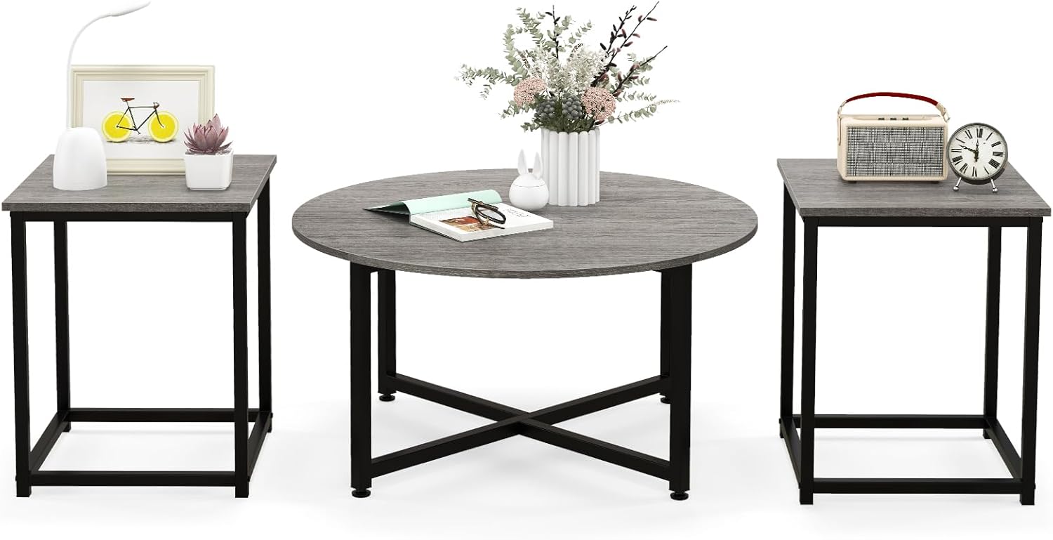 Lot de 3 tables basses, 1 table ronde et 2 tables d'appoint carrées, table moderne pour salon
