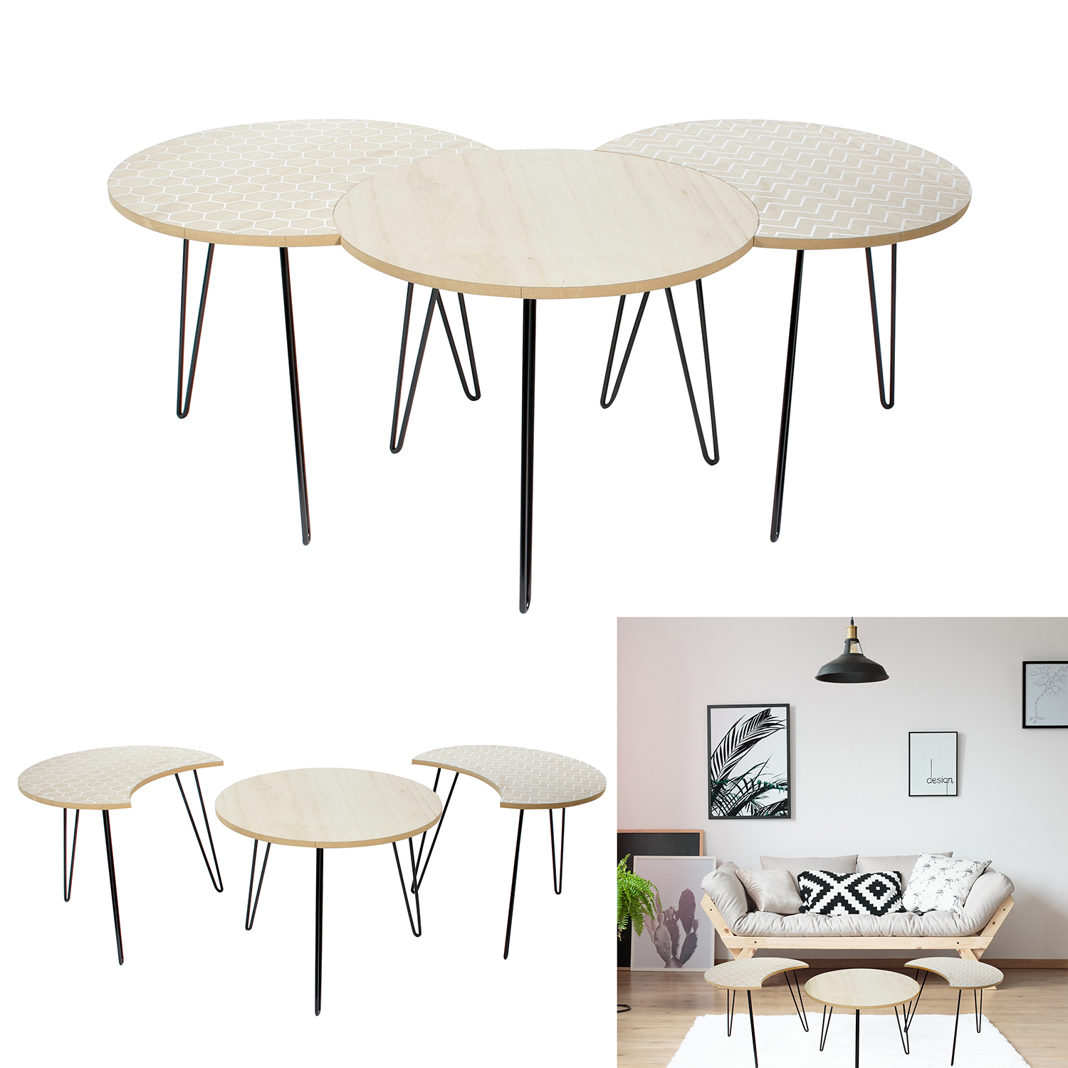 | Composition | 1 table ronde et 2 tables croissant de lune aux motifs différents |