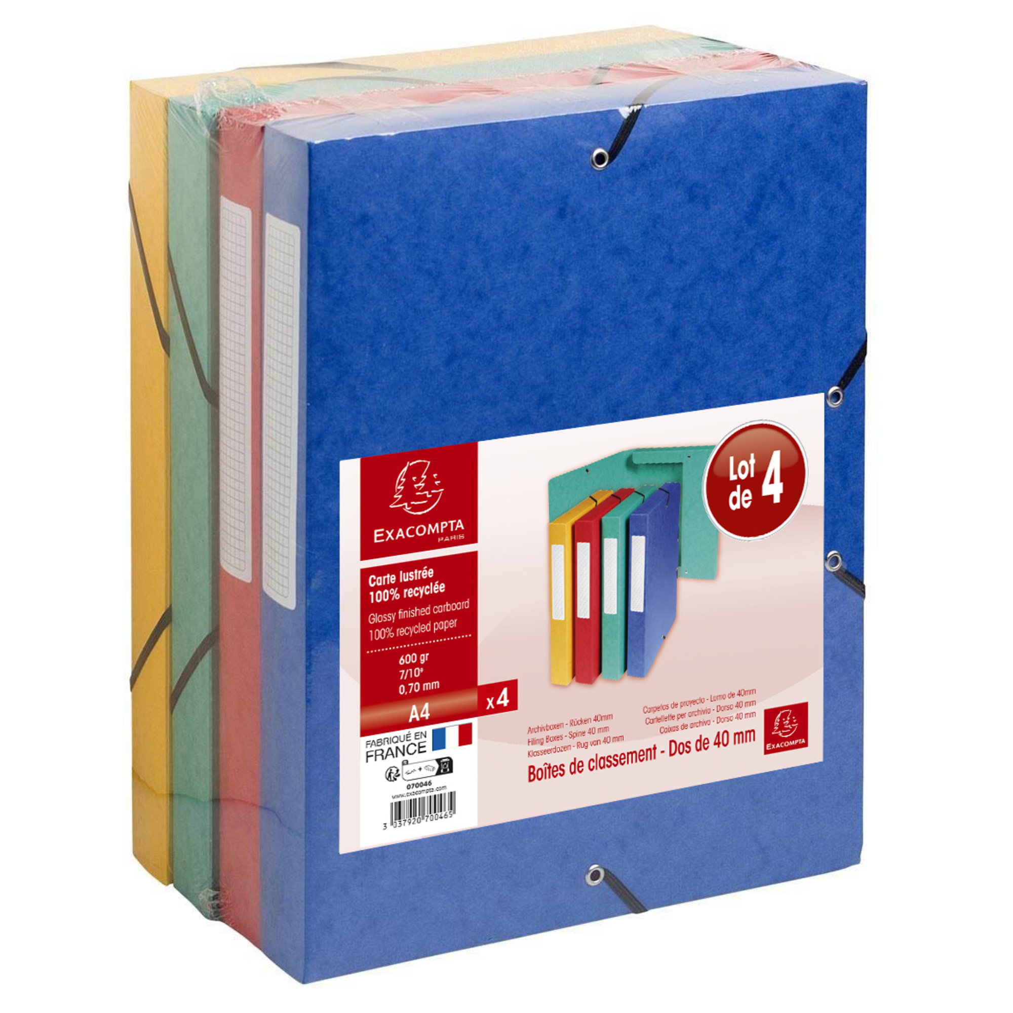 | Libellé | Lot de 4 boîtes de classement à élastique dos de 40 mm 240x320 carte lustrée 600g 4 couleurs assorties sous film avec encart exacompta |