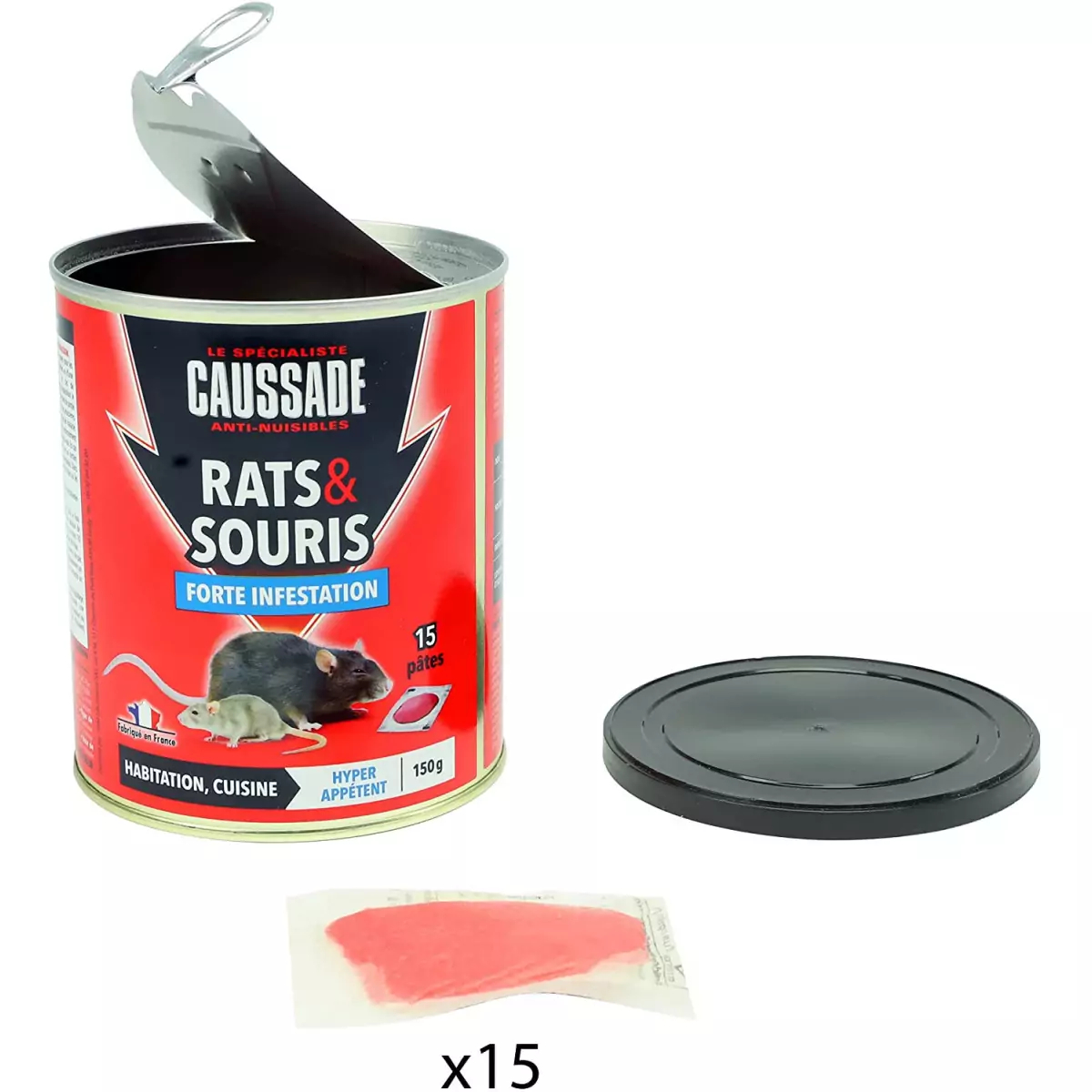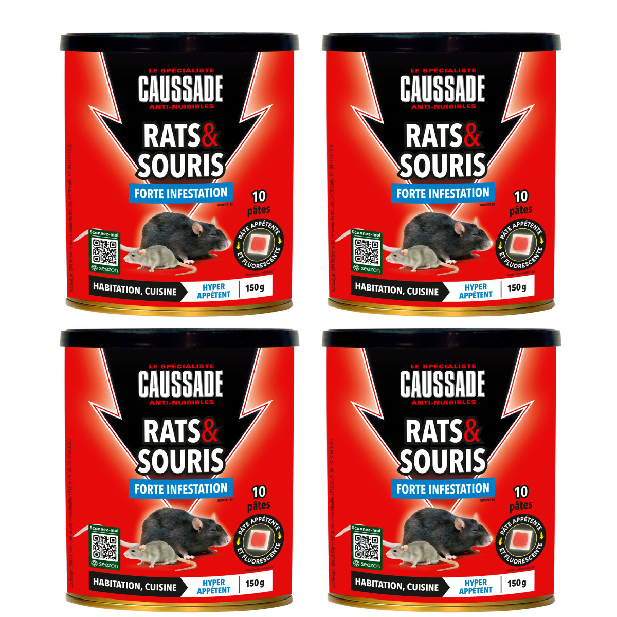 Les rongeurs ont envahi votre habitation, entrepôt, cuisine et vous avez des dégâts, signes d'une forte infestation. Caussade vous propose une pâte dotée d'une grande appétence pour attirer et éliminer l'ensemble de la colonie.Forte infestation• 1 seule ingestion suffit• Idéal pour lieux secs et/ou humides tels qu'habitation, entrepôt, cuisine• Curatif• Souris : 30 à 50 g, soit 2 à 3 sachets d'appât par station d'appât.• Rats : 60 à 80 g, soit 4 à 5 sachets d'appât par station d'appât.• AMM FR N° 2023-0012. Composition : Brodifacoum 0,0017 % m/m (CAS N°56073-10-0). vendu en pack de 4 boitesUtilisez les produits biocides avec précaution. Avant toute utilisation, lisez l'étiquette et les informations sur le produit