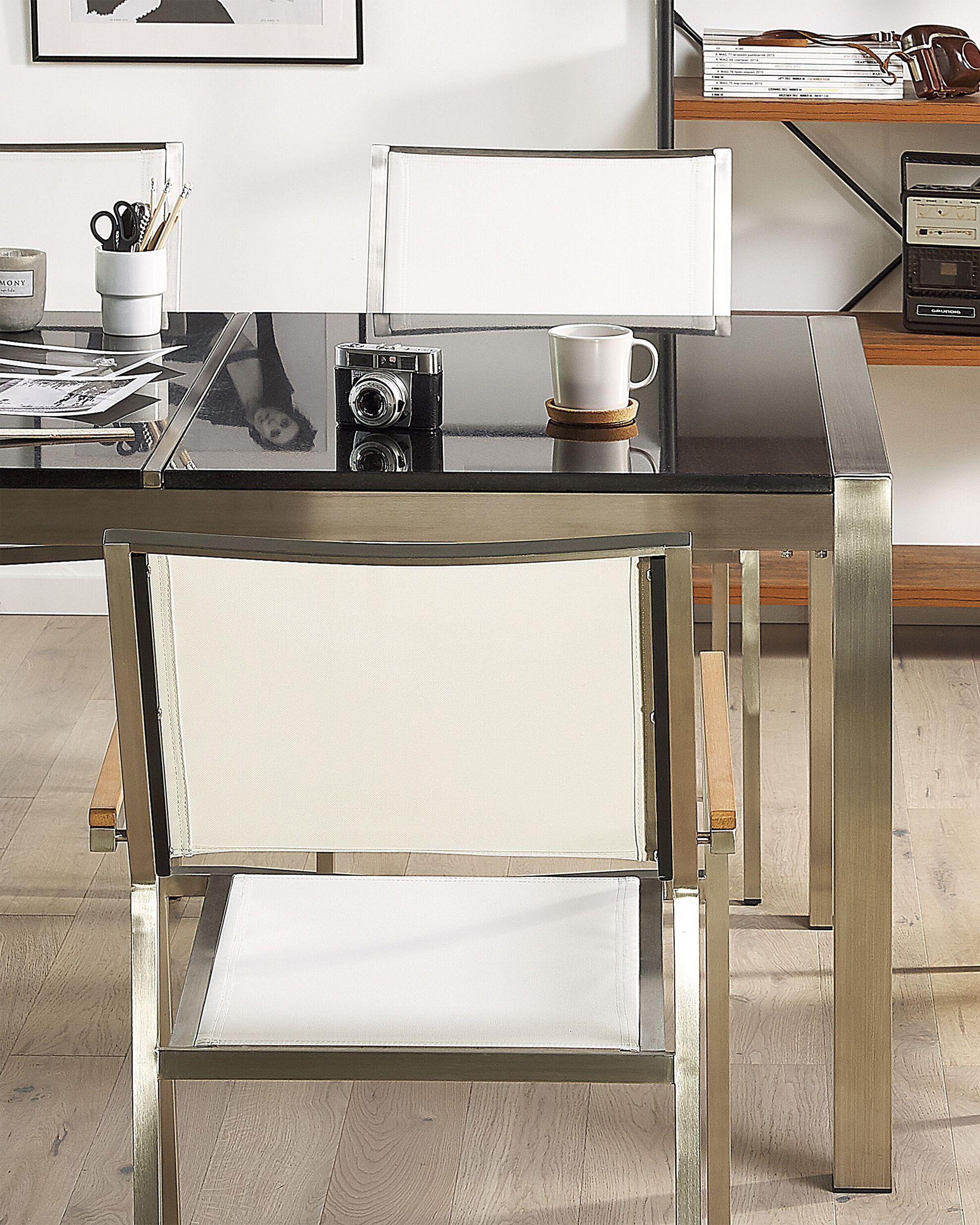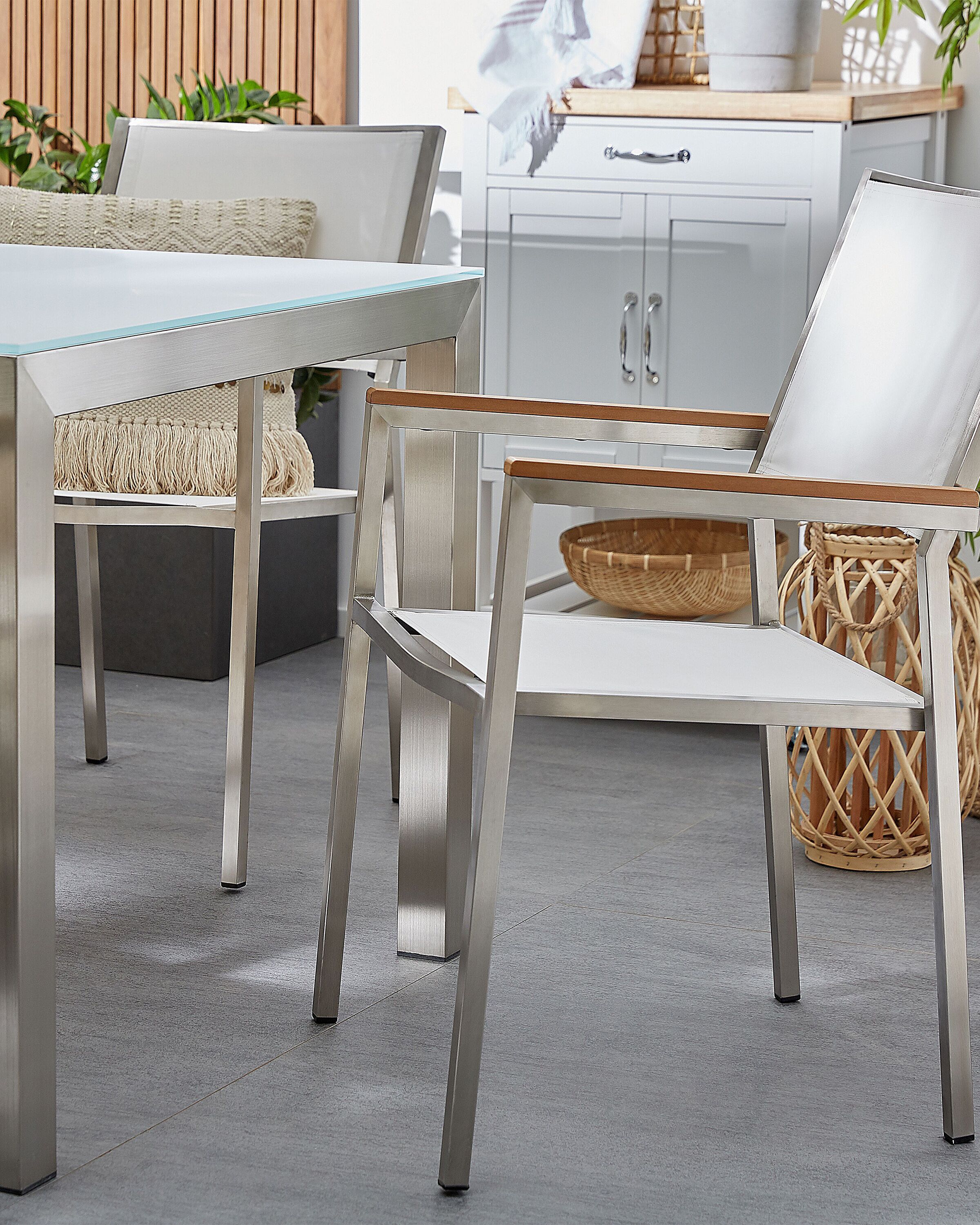 Fauteuils metteur en scène. Cet ensemble de chaises d'extérieur est le choix idéal pour un coin repas dans votre jardin. Le cadre est fabriqué en acier inoxydable pour assurer la stabilité, tandis que les accoudoirs en bois protègent votre corps du froid du métal. L'assise et le dossier sont fabriqués en fibre textile pour un confort maximal. Installez-vous confortablement et profitez du soleil dans cette chaise.