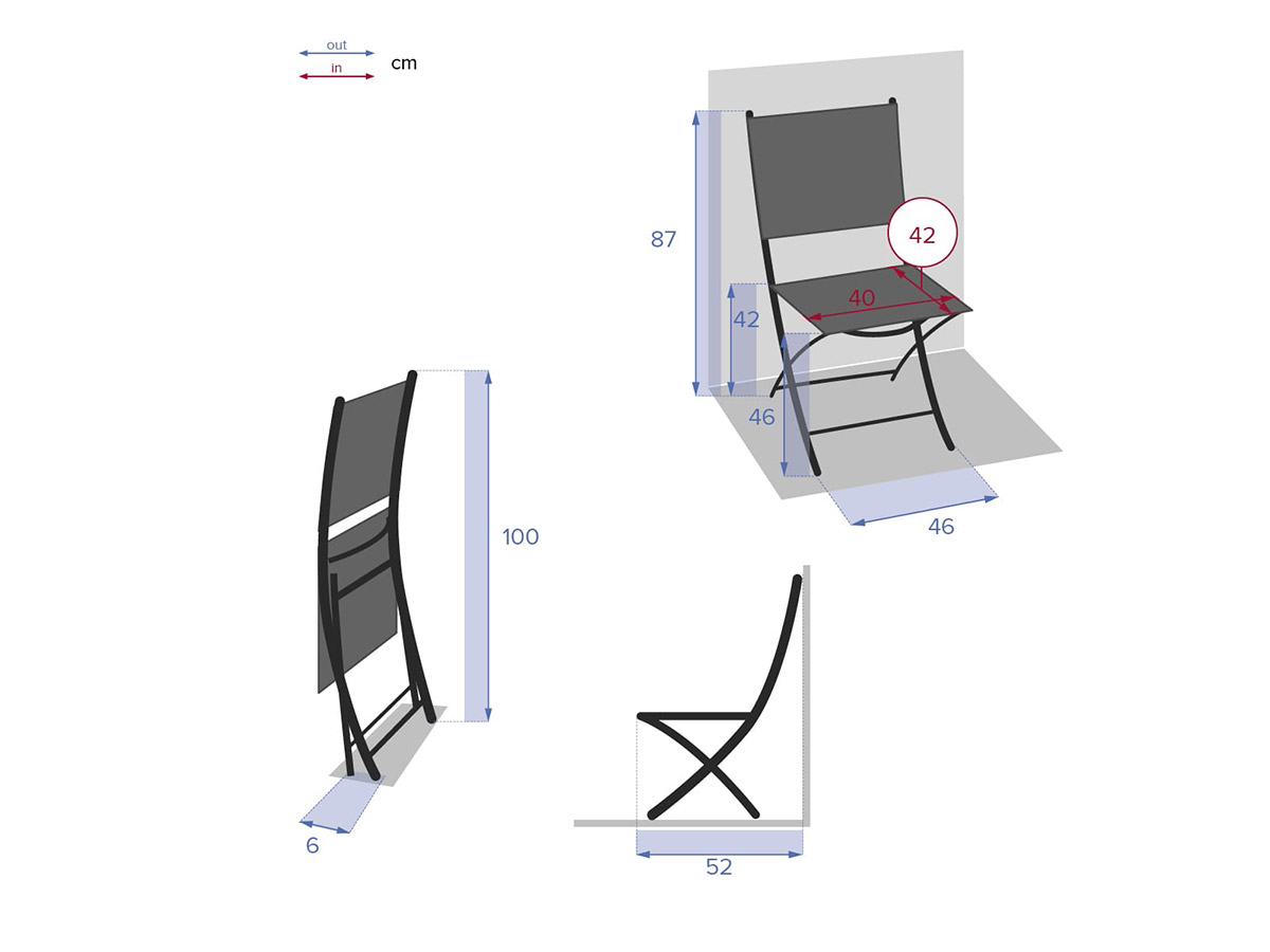 Chaises de jardin pliante métal Modula Hesperide. Assise en texaline et structure en métal. Chaises pliantes. Différentes couleurs disponibles. • Dimensions de la chaise dépliée (L x P x H) : 46 x 52 x 86 cm • Dimensions de la chaise pliée (L x P x H) : 100 x 46 x 14.5 cm • Hauteur d'assise avant : 46,5 cm • Hauteur d'assis arrière : 42,5 cm Caractéristiques techniques Couleur:Gris Dimensions (L x l x H):52 x 46 x 87 cm Empilable:Non Garantie:2 ans Grammage:580 g/m' Hauteur d'assise:46,5 cm Marque:HESPERIDE Matière de l'assise:Texaline Matière(s):Acier traité epoxy Pliante:Oui Poids:3,5 kg Poids maximum supporté:110 kg Type de produit:Chaise