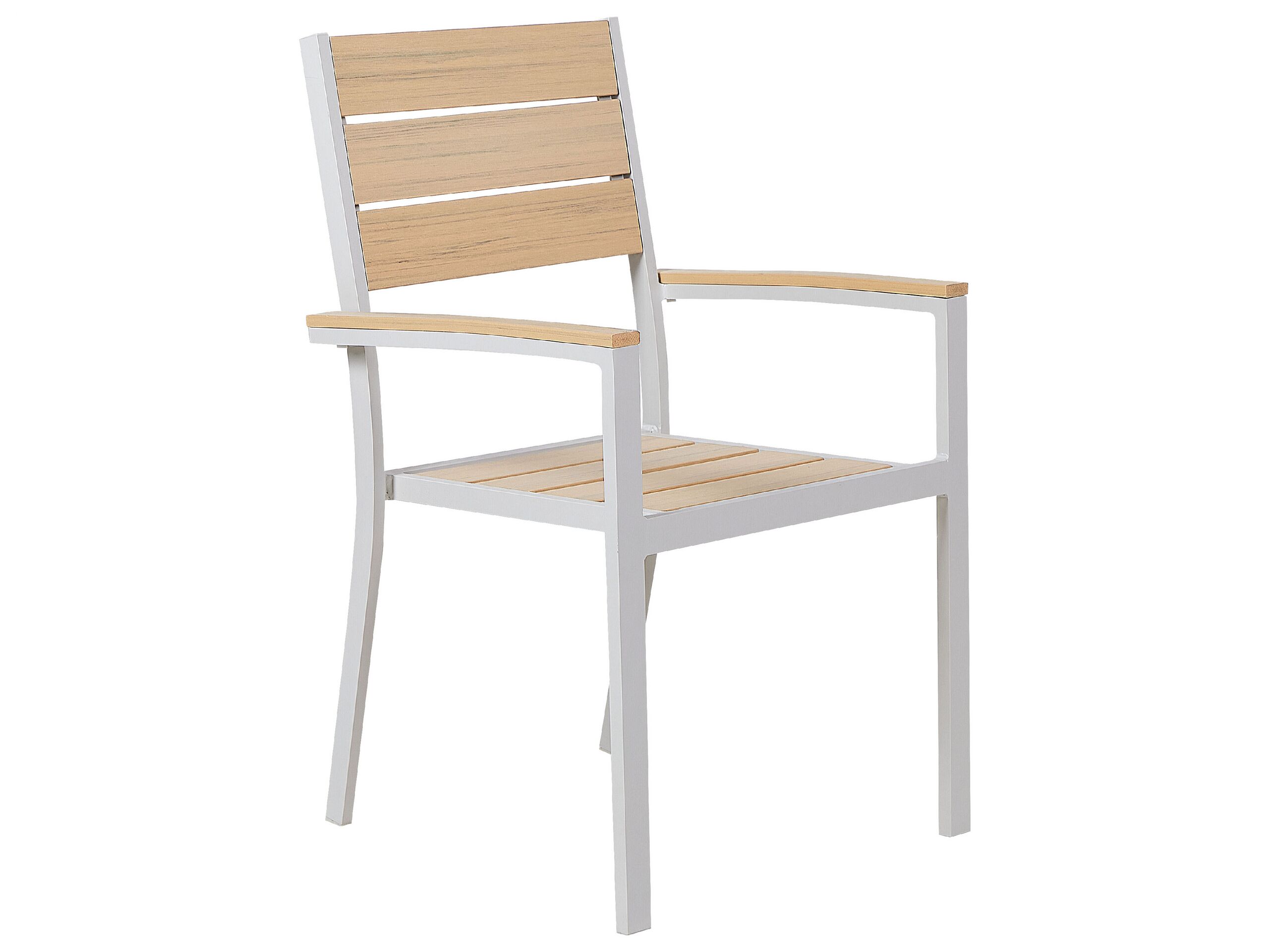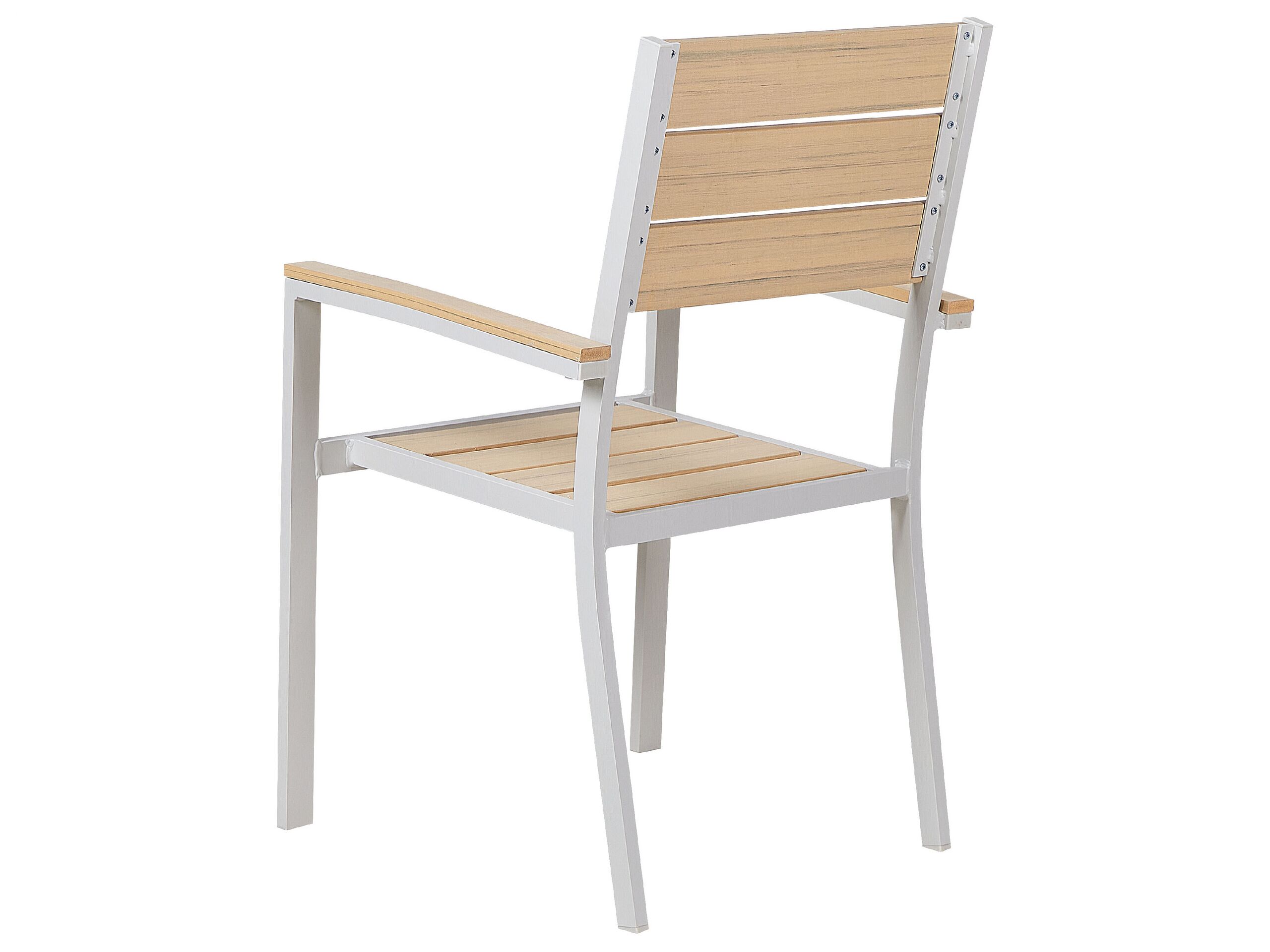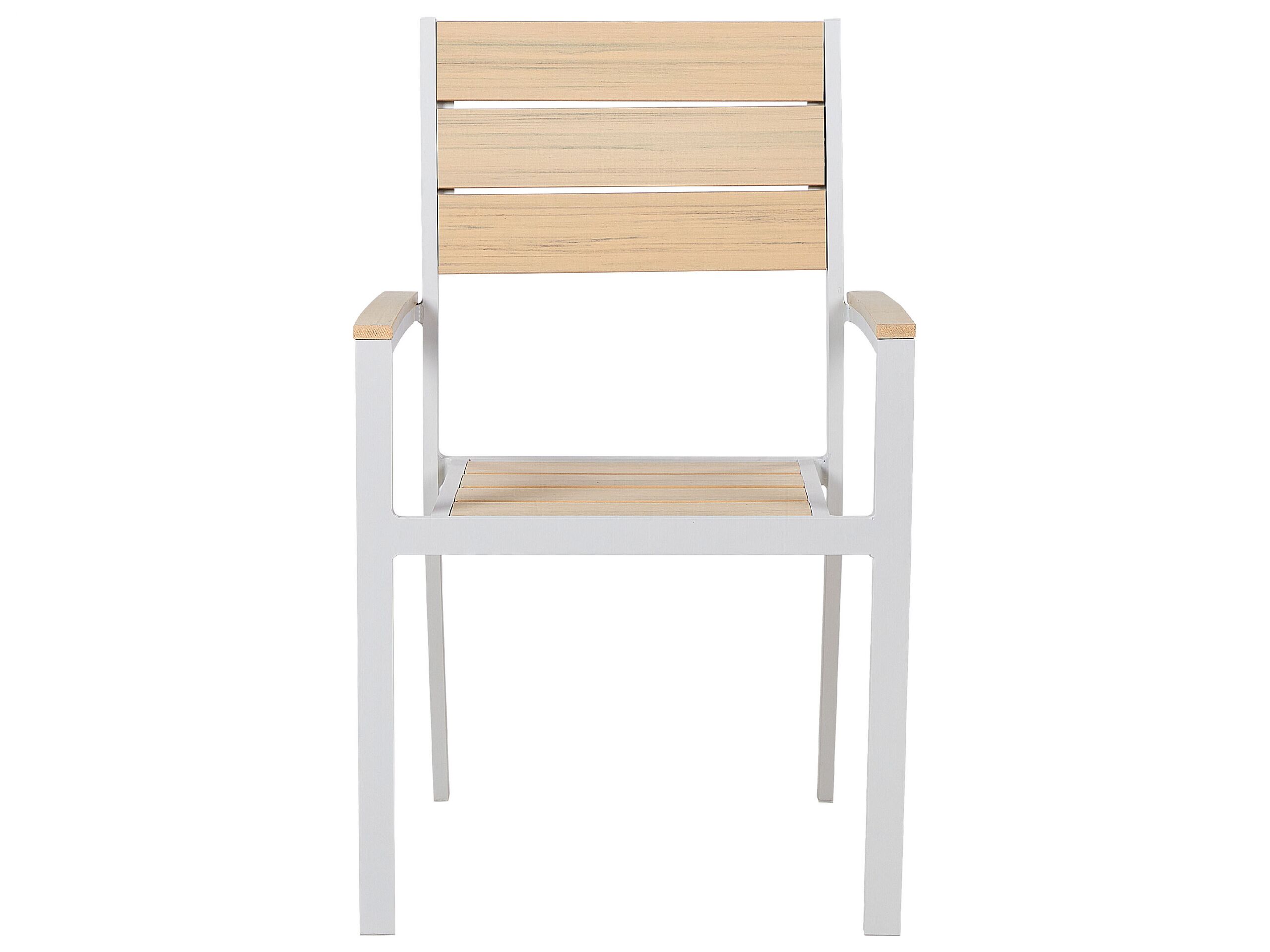 Ensemble de chaises de repas en bois plastique. Ces chaises de jardin au design épuré et minimaliste deviendront un ajout parfait à votre extérieur. Le cadre en aluminium enduit de poudre avec du bois synthétique robuste garantit la durabilité et l'apparence moderne de ces chaises. La large assise avec le dossier qui soutient le corps garantit un confort d'assise optimal. Résistantes aux intempéries, ces chaises sont conçues pour vous servir toute l'année pendant une longue période.
