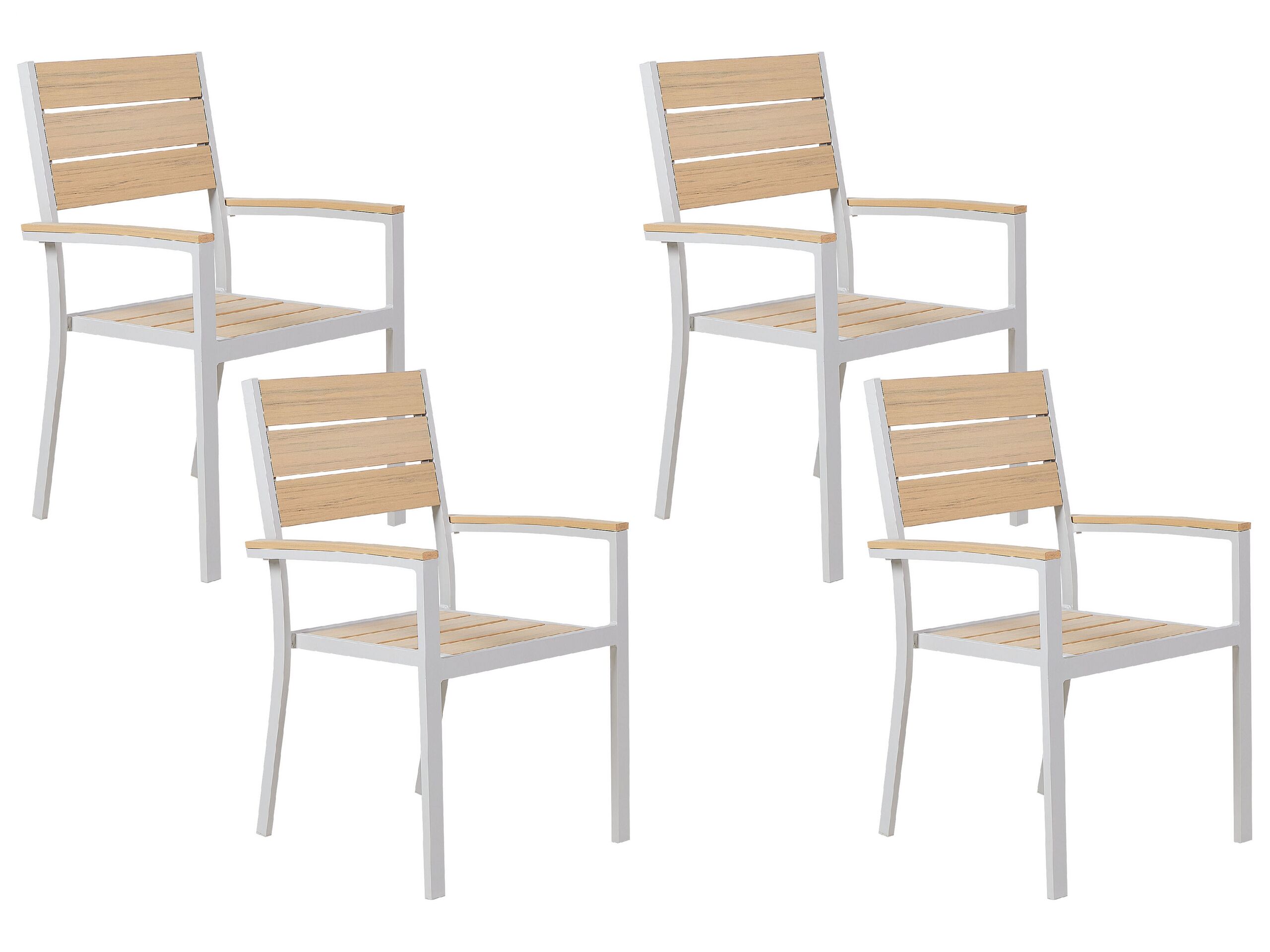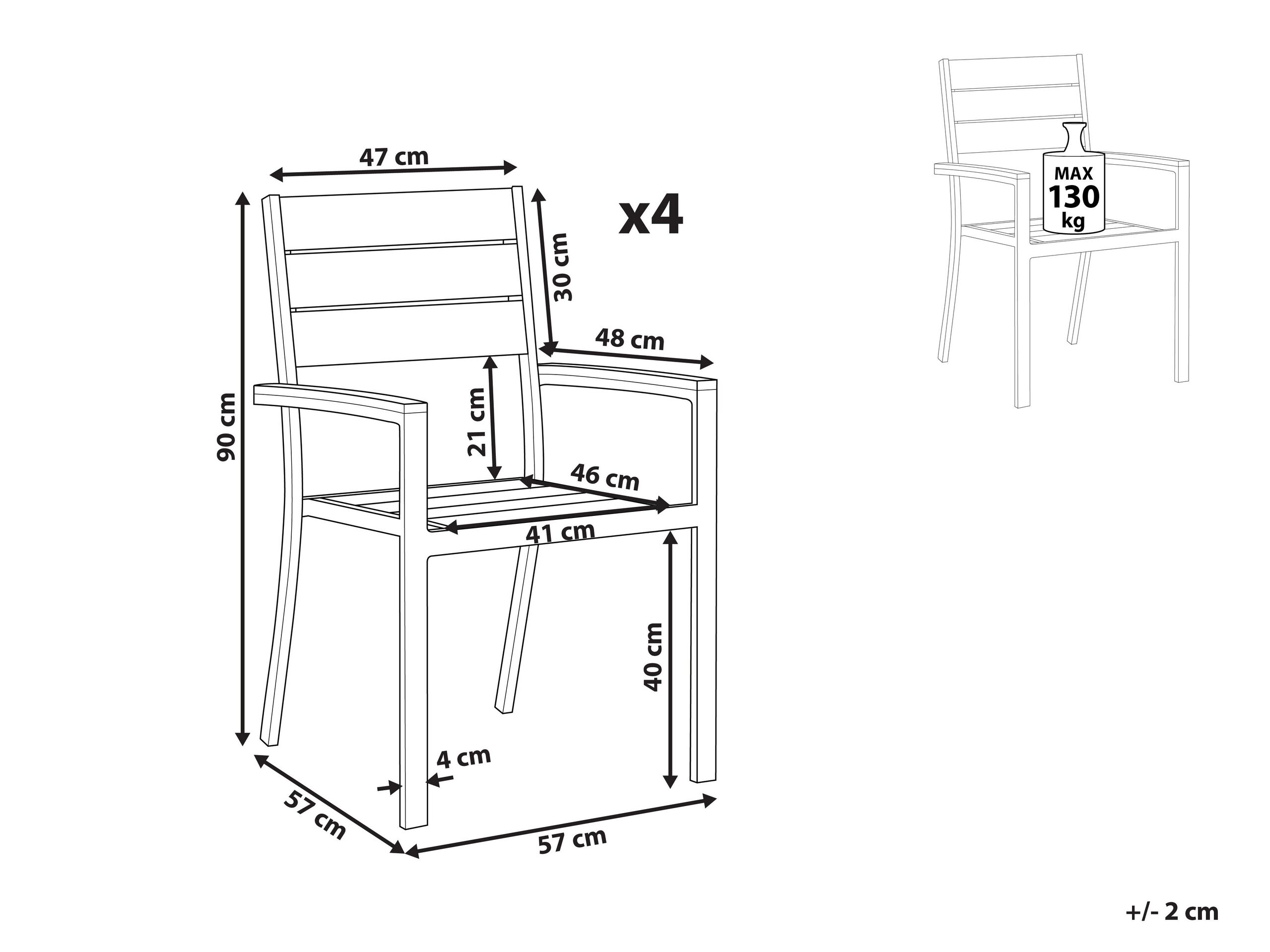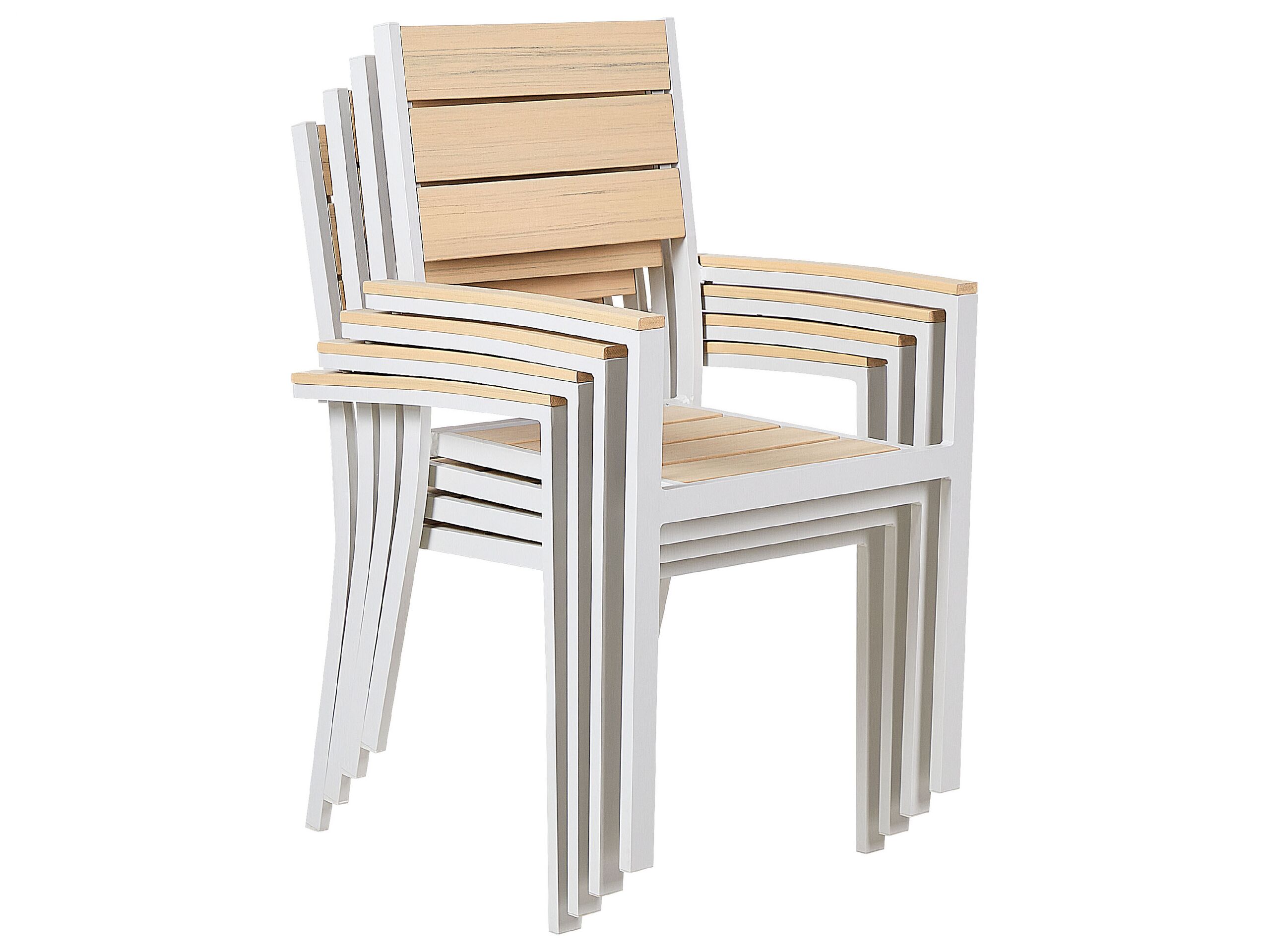 Ensemble de chaises de repas en bois plastique. Ces chaises de jardin au design épuré et minimaliste deviendront un ajout parfait à votre extérieur. Le cadre en aluminium enduit de poudre avec du bois synthétique robuste garantit la durabilité et l'apparence moderne de ces chaises. La large assise avec le dossier qui soutient le corps garantit un confort d'assise optimal. Résistantes aux intempéries, ces chaises sont conçues pour vous servir toute l'année pendant une longue période.
