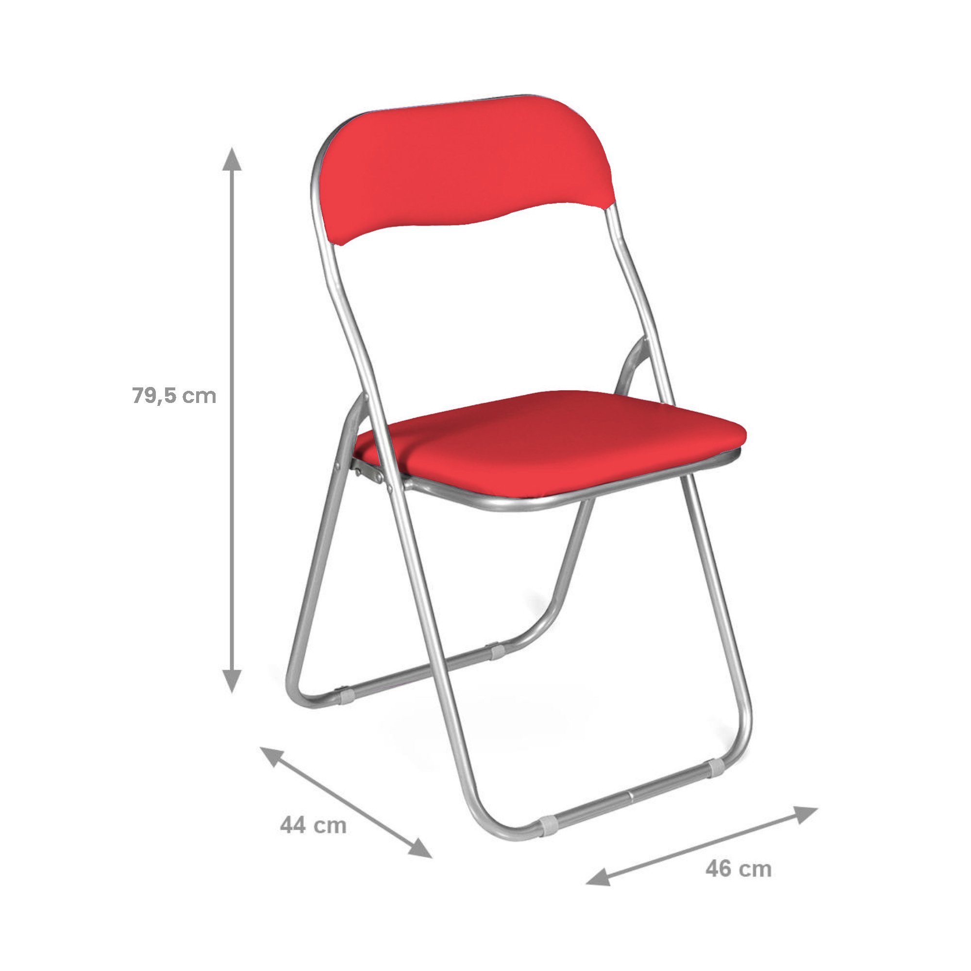 LOT DE 4 CHAISES PLIANTE - Fauteuil gain de place, Chaise invité, Siège de réunion en PU, 43x47h80 cm, Rouge. STRUCTURE ET UTILISATION - Ensemble de quatre chaises avec structure en métal résistant, avec assise et dossiers rembourrés en mousse de polyuréthane enduite PVC - Produit idéal pour une utilisation au bureau lors de réunions, conférences ou réunions d'affaires, ou à la maison pour des invités, amis ou parents en plus de vos sièges dans la salle à manger ou la cuisine - Facilement pliable, idéal pour ranger dans de petits espaces, comme derrière une porte, un placard - Les lignes simples et modernes de ces chaises permettent de les placer dans tout type d'environnement. PRATIQUE ET INNOVANT - Meuble pratique et moderne, parfait pour être placé dans un environnement ou un appartement avec des besoins d'espace - Produit polyvalent, idéal pour tout type de bureau ou salle d'attente. CARACTÉRISTIQUES TECHNIQUES - Entièrement réalisé en polyuréthane expansé sur une structure métallique, il permet de s'asseoir en toute sécurité - L'article est facile à nettoyer grâce au matériau qui le compose - Livré déjà monté. DIMENSIONS EN CM - Chaise pliante: Longueur: 43 Largeur: 47 Hauteur: 79,5 - Hauteur d'assise: 43