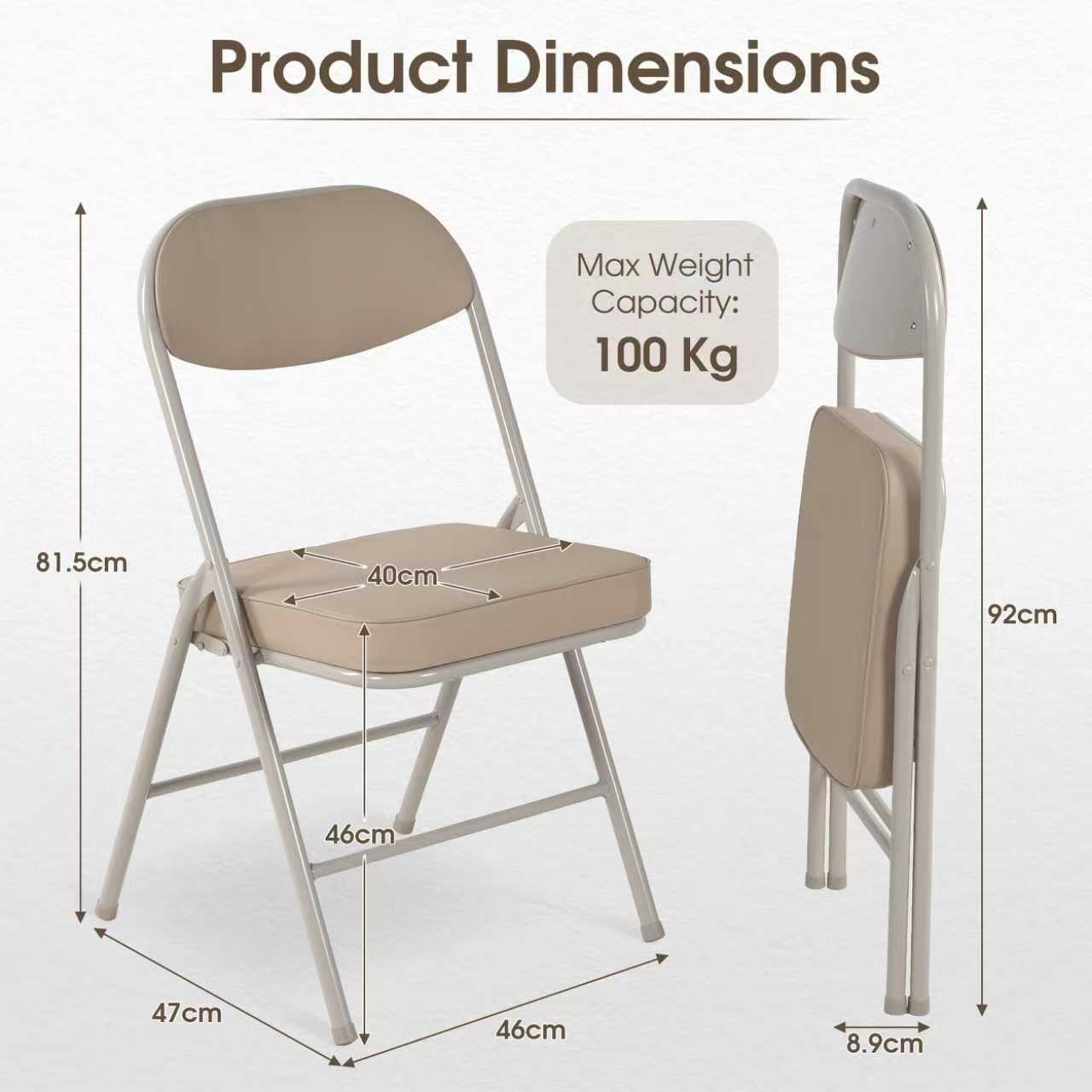 Chaque chaise pèse env. 4,5 kg et se plie facilement pour un rangement compact et un transport pratique, idéal pour les petits espaces ou le camping. Le revêtement en PU est simple à nettoyer d’un coup d’éponge et résiste aux taches et à l’usure. Aucun montage requis