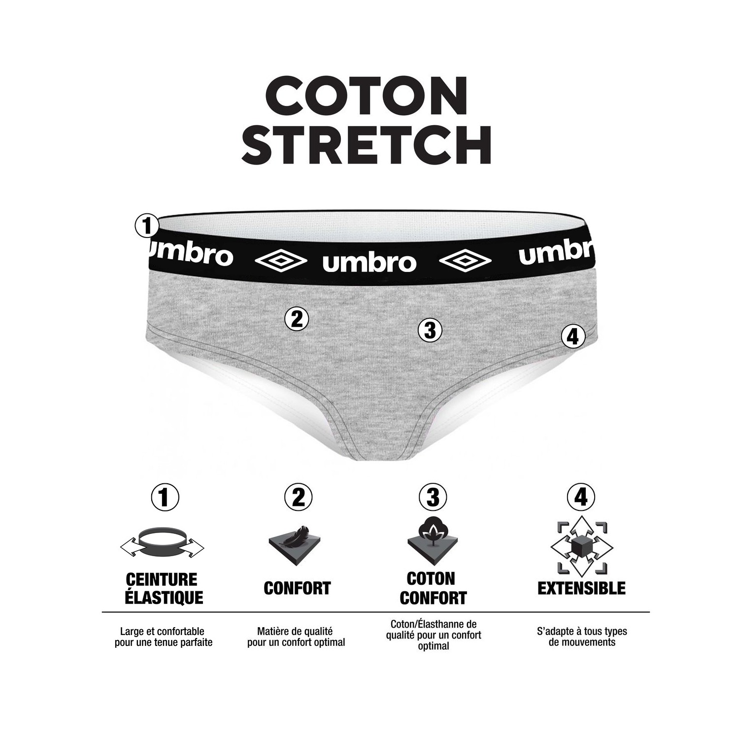 Des culottes pour femme sobre et confortable grâce au coton ! Umbro vous propose ce superbe lot de 4 culottes pour vous donner un style moderne. Vous pourrez retrouver sur l'élastique des culottes le logo de la marque.