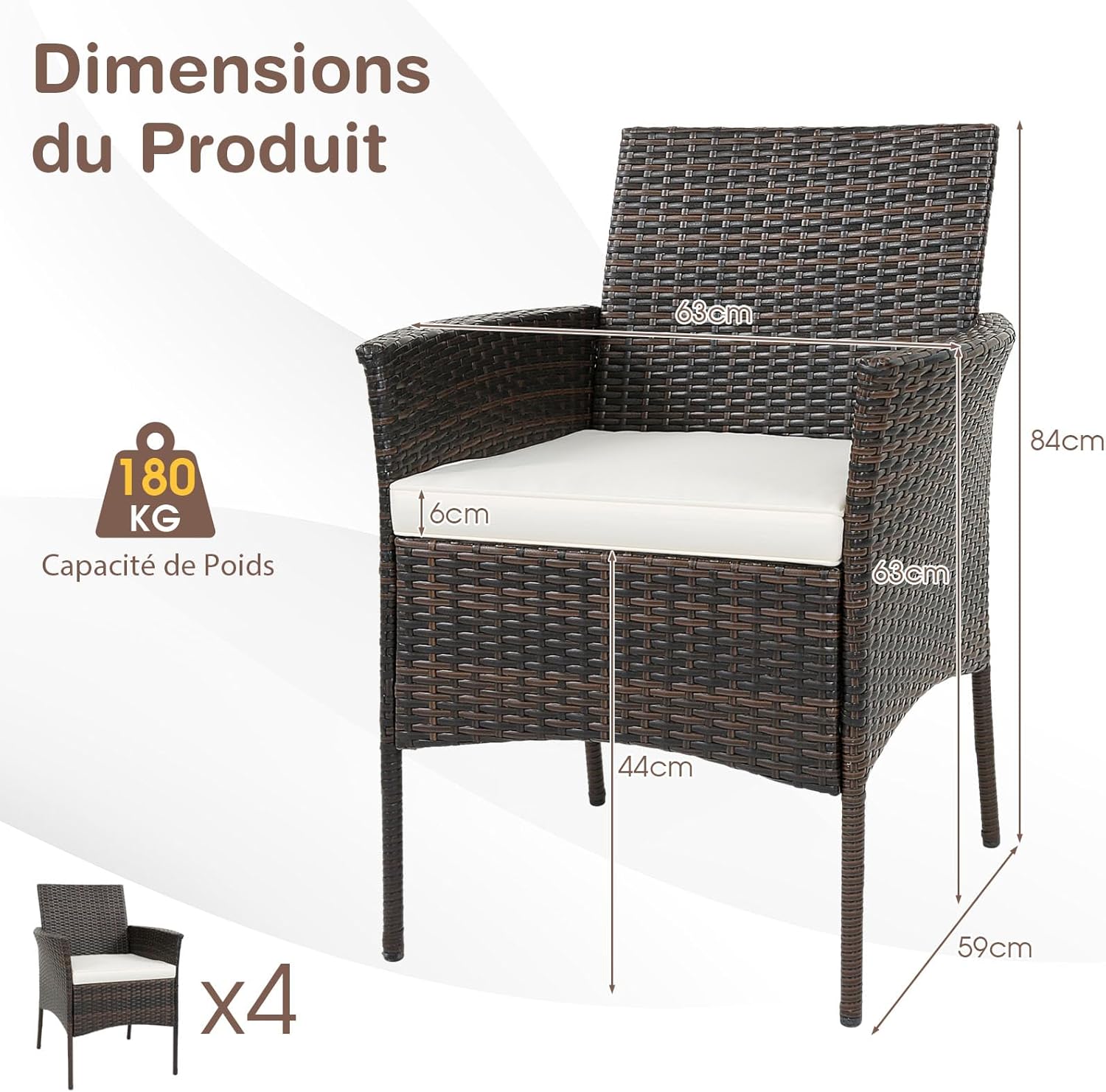 | Libellé | Lot de 4 fauteuils jardin extérieurs en rotin, ensemble de chaises de jardin avec coussins amovibles |