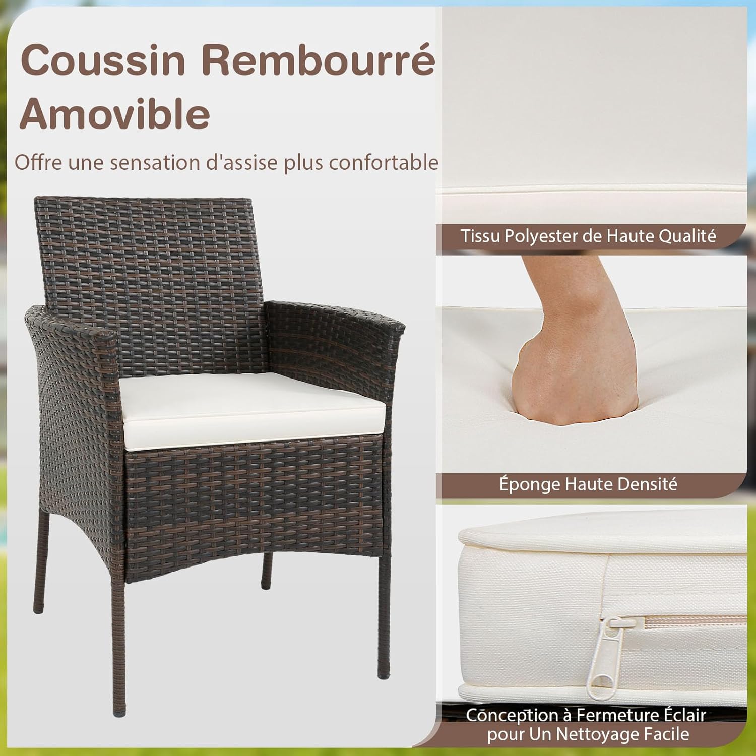 Fabriquées en rotin PE de haute qualité et résistant au soleil, les chaises de salle à manger ne sont pas faciles à déformer ou à casser pour une longue durée de vie. Les pieds de soutien stables avec patins antidérapants améliorent la stabilité et ont une grande capacité de charge allant jusqu'à 180 kg per chaise. En outre, le siège avec coussin rembourré, le dossier ergonomique et les accoudoirs confortable visent à soulager la fatigue de votre corps. Les housses de coussin avec fermeture éclair peuvent être facilement retirées pour nettoyer. Grâce à son aspect élégant, le lot de 4 chaises extérieurs peut être utilisé dans les jardins, les patios, les terrasses, les piscines, etc.