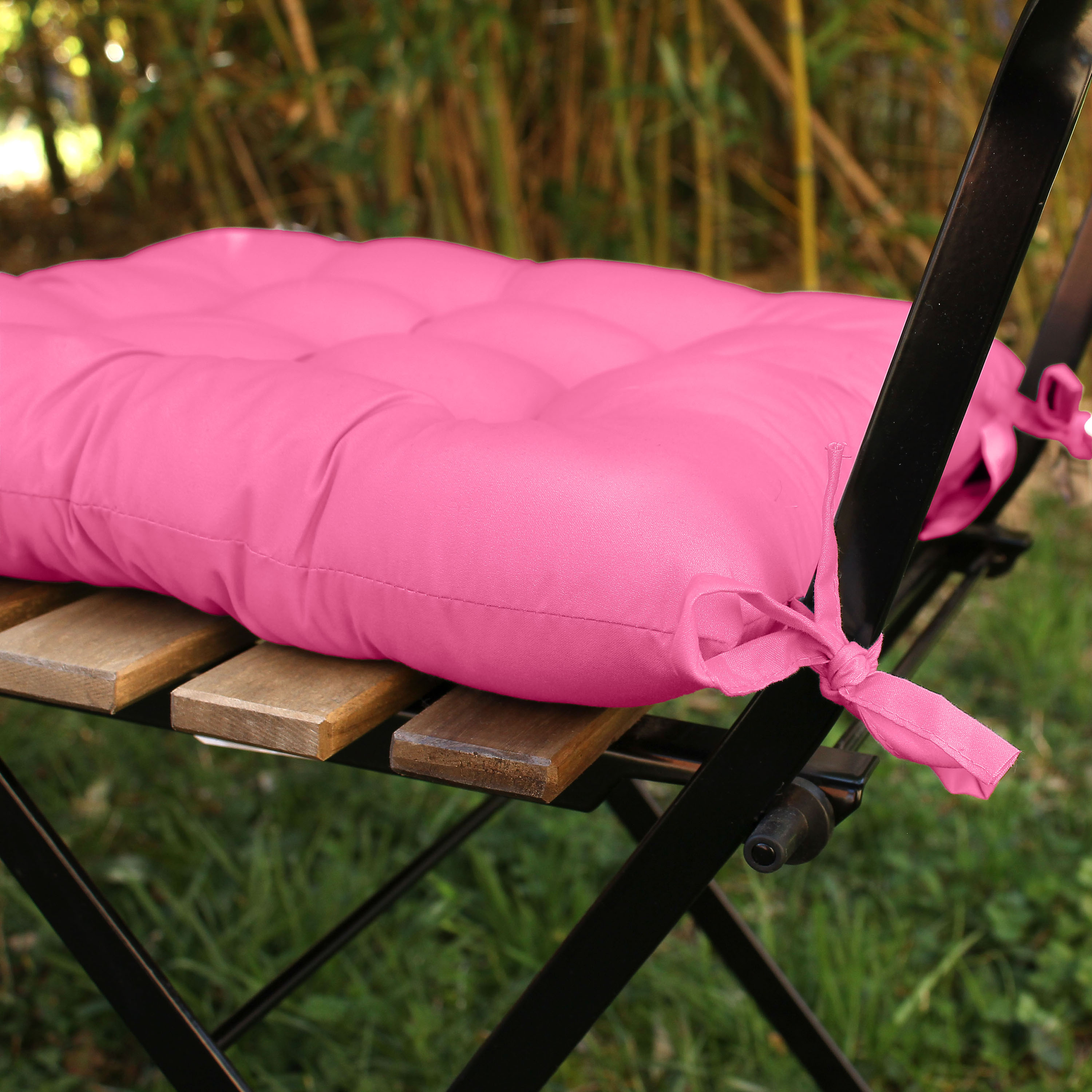 Avec son format 38x38cm et ses nouettes, elle s'adapte parfaitement aux chaises de jardin standard.