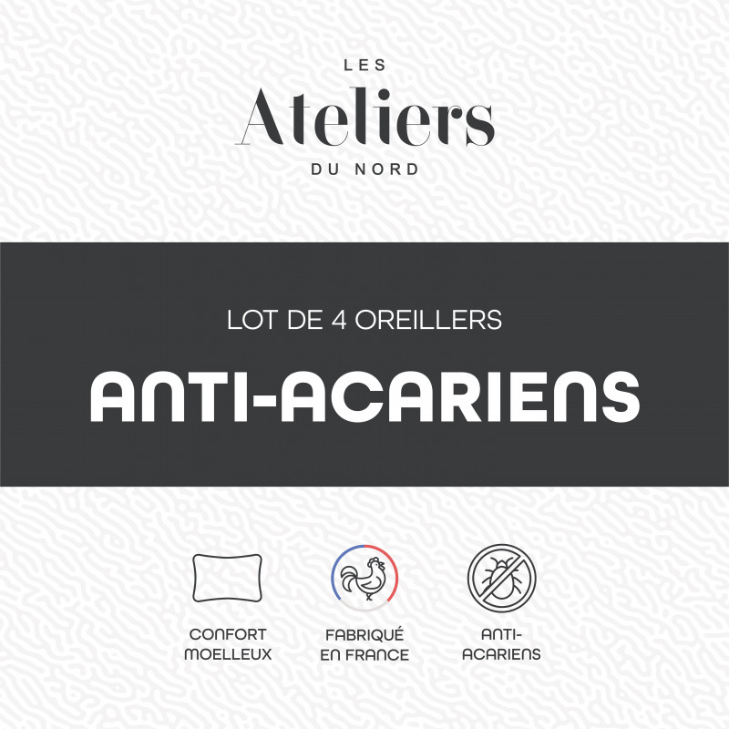Pour équiper toute la famille ou pour bénéficier d'un max de confort, optez pour le lot de 4 Oreillers Anti-acariens des Ateliers du Nord ! Chaque oreiller bénéficie du traitement Sanitized®, qui offre une double protection efficace contre les acariens et le développement des bactéries. Leur enveloppe microfibre douce au toucher peau de pêche et leur garnissage en fibre creuse siliconée assurent un confort moelleux et une excellente circulation de l'air, limitant l'humidité pendant la nuit.