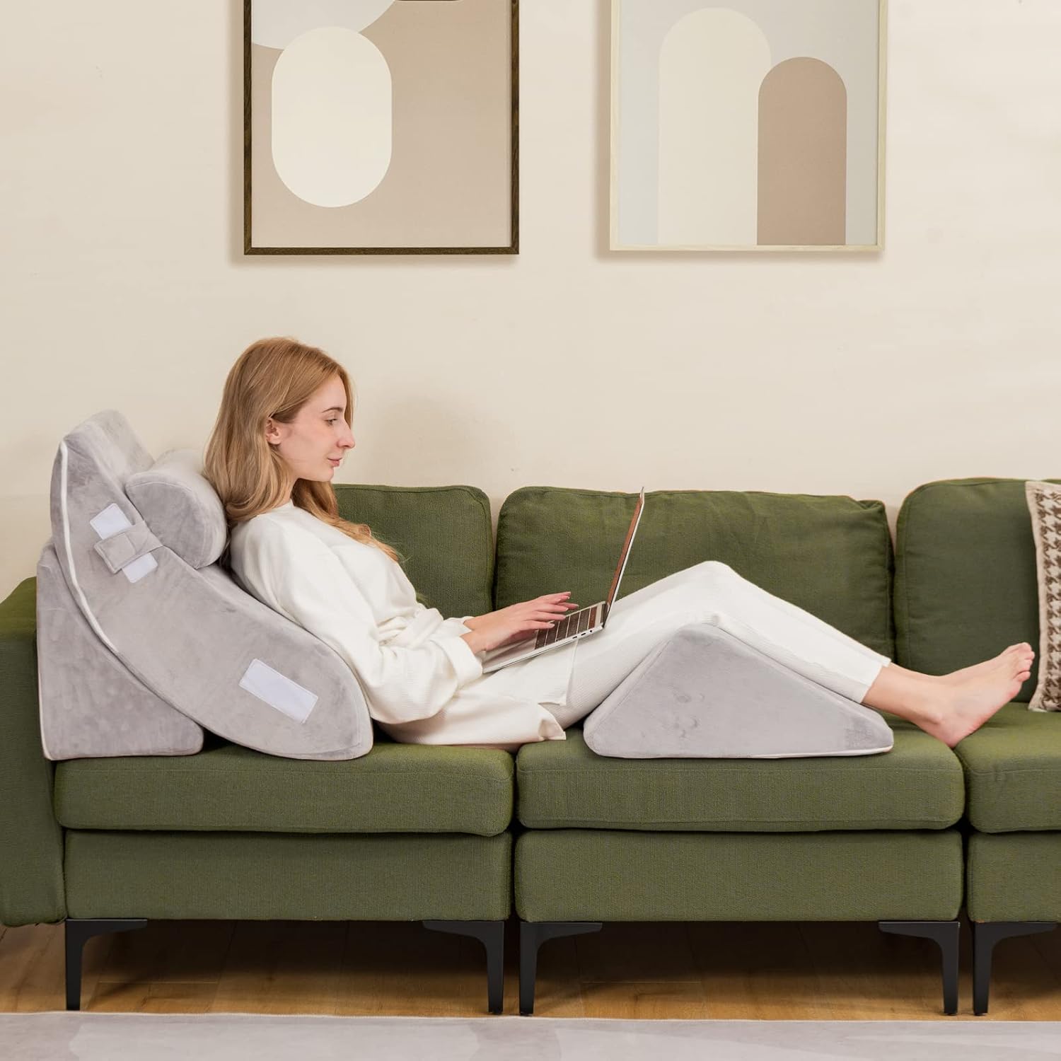• Soutien Multizone Intelligent:Oreillers orthopédiques ajustables avec 12 points de contact (cou/jambes/lombaires) + coussins relève-jambes triangulaires. Parfait pour lecture/télétravail/sieste sur lit/canapé. Position semi-allongée ergonomique certifiée par des kinésithérapeutes.
