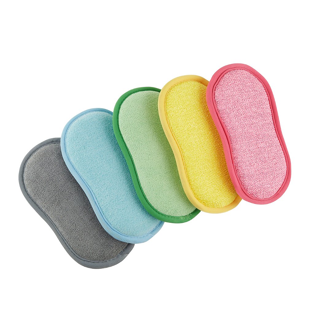 Lot de 5 éponges réutilisables - 2 en 1 - lavable à 40°C - gris, bleu, vert, jaune, rose