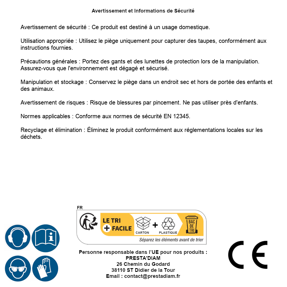 | Précautions d'emploi | Avertissement de sécurité : Ce produit est destiné à un usage domestique. Utilisation appropriée : Utilisez le piège uniquement pour capturer des taupes, conformément aux instructions fournies. Précautions générales : Portez des gants et des lunettes de protection lors de la manipulation. Assurez-vous que l'environnement est dégagé et sécurisé. Manipulation et stockage : Conservez le piège dans un endroit sec et hors de portée des enfants et des animaux. Avertissement de risques : Risque de blessures par pincement. Ne pas utiliser près d'enfants. Normes applicables : Conforme aux normes de sécurité EN 12345. Recyclage et élimination : Éliminez le produit conformément aux réglementations locales sur les déchets. |
