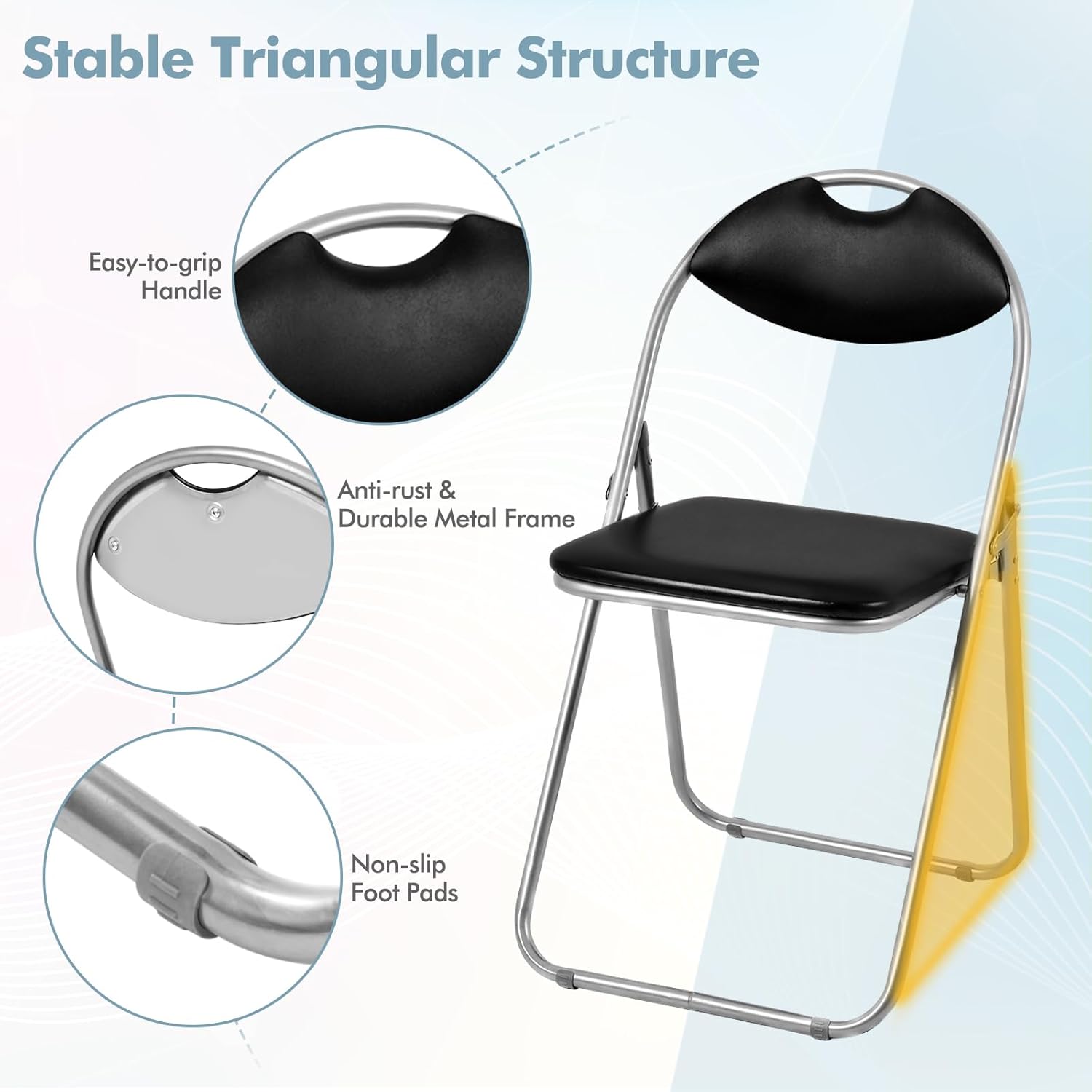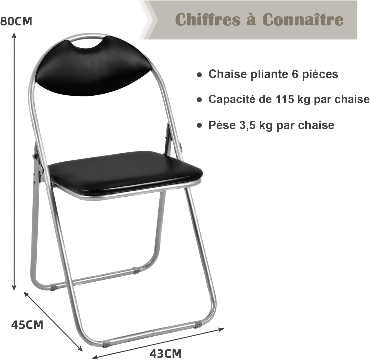 - Structure stable & durable : Notre ensemble de 6 chaises pliantes est doté d'une solide cadre métallique qui assure une excellente stabilité et durabilité. Cette structure solide est conçue pour supporter jusqu'à 115 kg.