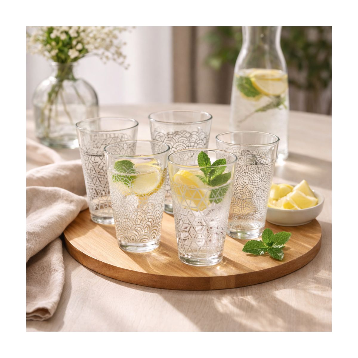 Chaque verre, aux teintes gris et transparent et au design épuré, combine motifs variés et formes soignées, offrant une présentation esthétique et fonctionnelle pour vos boissons préférées.