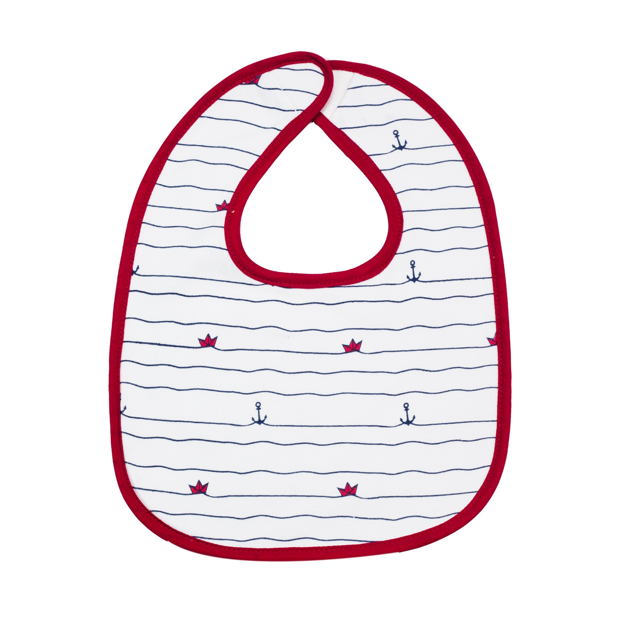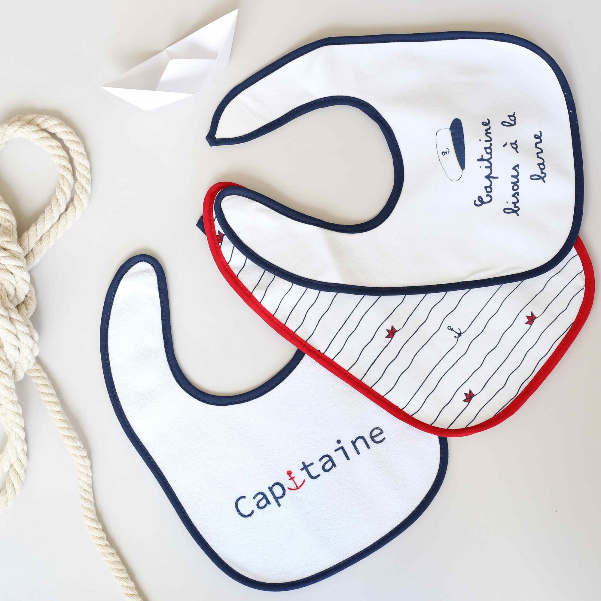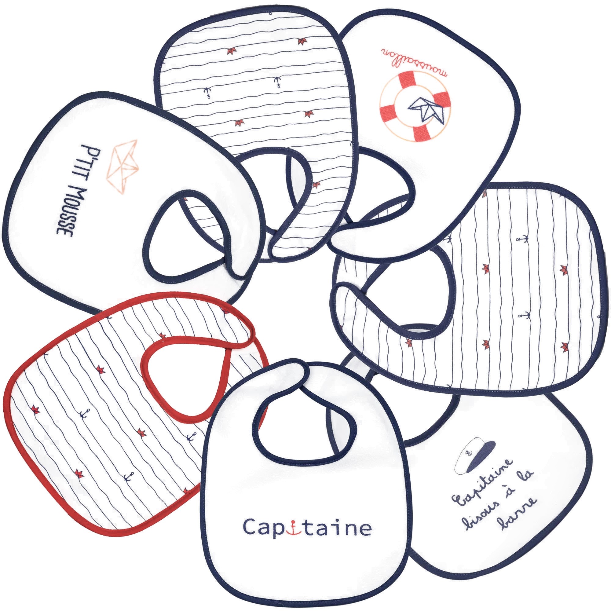 Ce lot de 7 bavoirs ultra tendance ravira votre petit moussaillon. Rouge, marine et blanc, ils sont composés et doublé d'éponge, avec un intérieur TPU les rendant waterproof. Votre bébé restera bien au sec et à l'abris des tâches pendant ses repas. De dimension 22x30cm, ils sont parfaits pour le 1er âge.