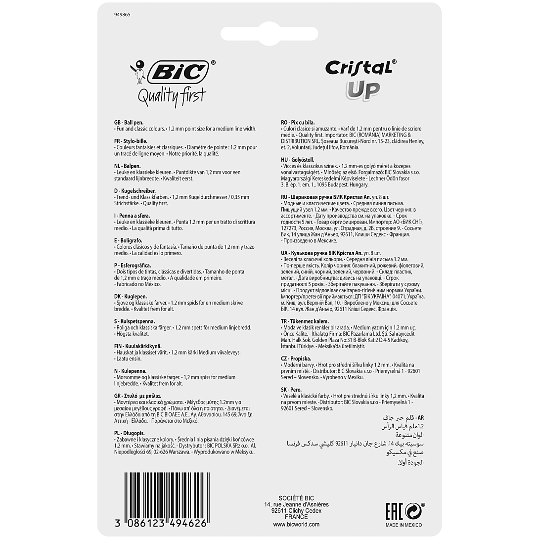 | Libellé | Lot de 8 BIC Cristal Up Stylos-Bille Pointe Moyenne (1,2 mm) - Couleurs Assorties |