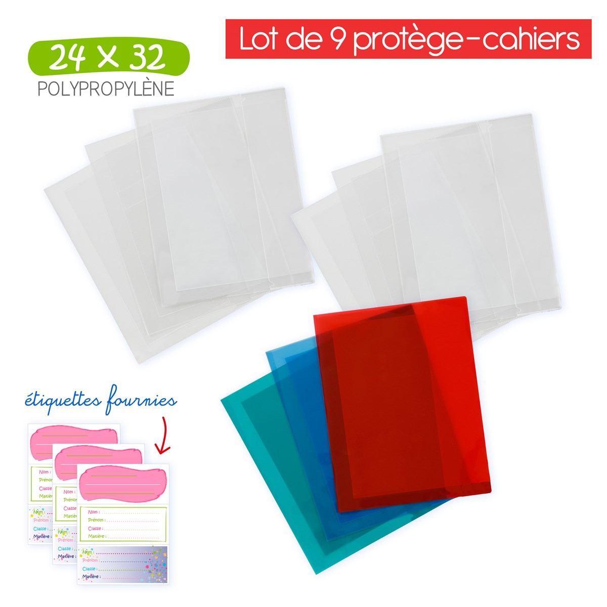 - FORMAT 24x32 : un protège cahier adapté à vos cahiers 24x32 cm. Assortiment : 1 rouge + 1 bleu + 1 vert + 6 incolore.