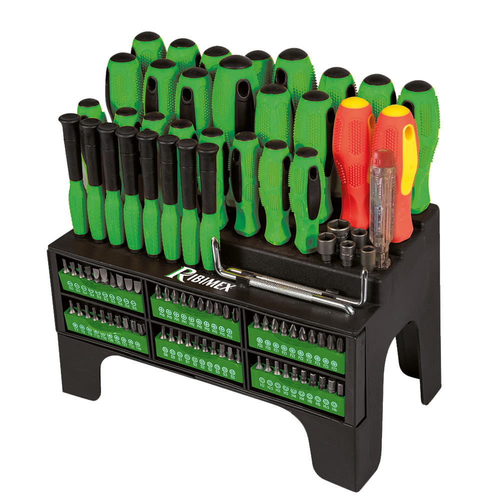 - Lot de tournevis et embouts 101 pièces avec support de rangementLot de tournevis et embouts 101 pièces avec support de rangement, référence PRTOUR101-S, marque RIBIMEX