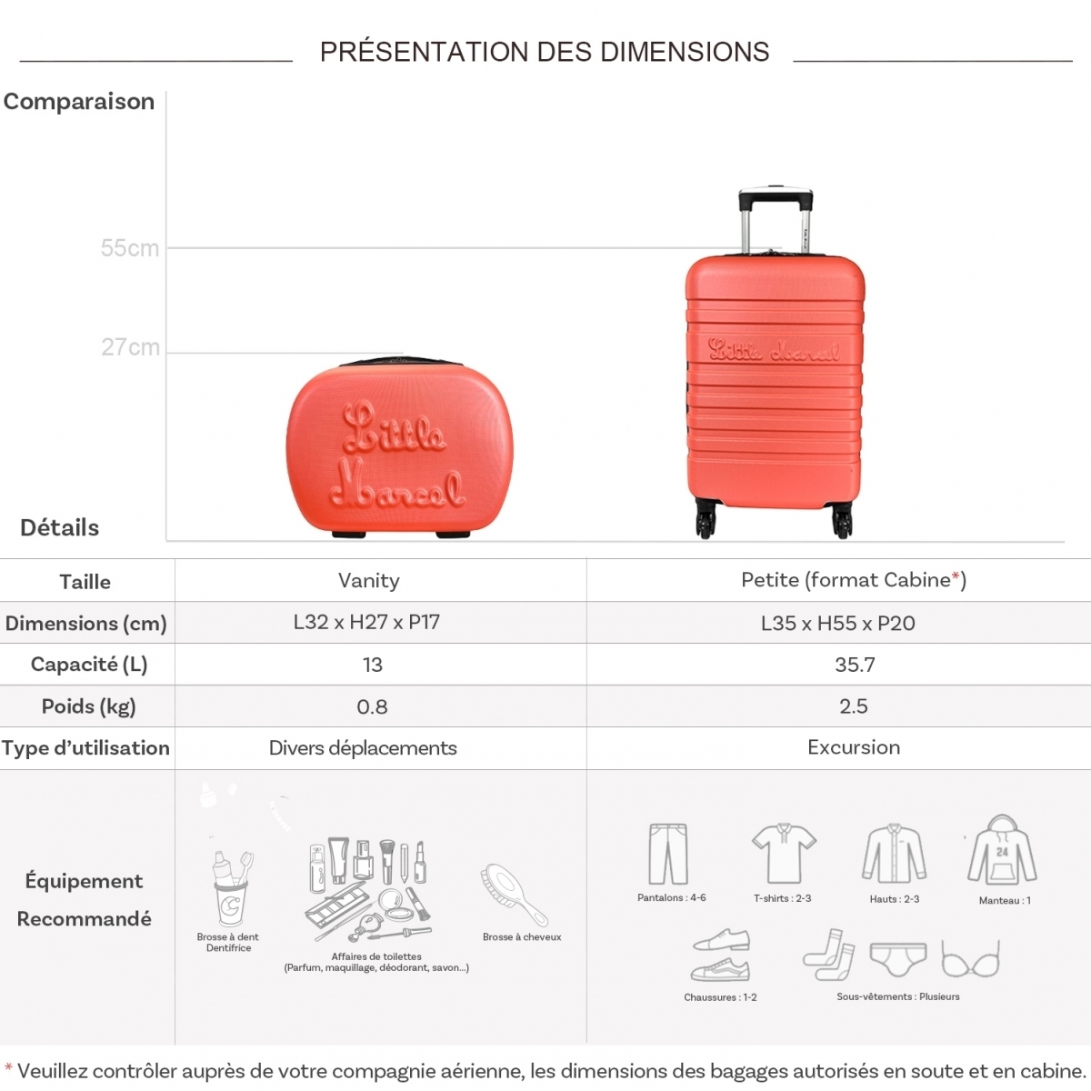 Les dimensions indiquées sont les dimensions extérieures des bagages, comprenant poignées, roulettes, pieds, poches latérales et autres éléments extérieurs.