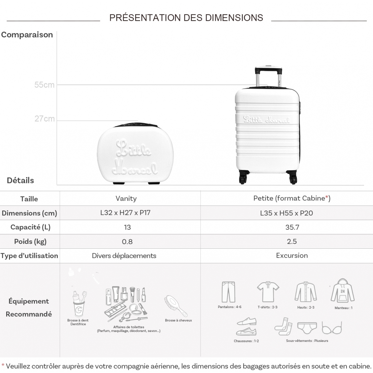 Les dimensions indiquées sont les dimensions extérieures des bagages, comprenant poignées, roulettes, pieds, poches latérales et autres éléments extérieurs.
