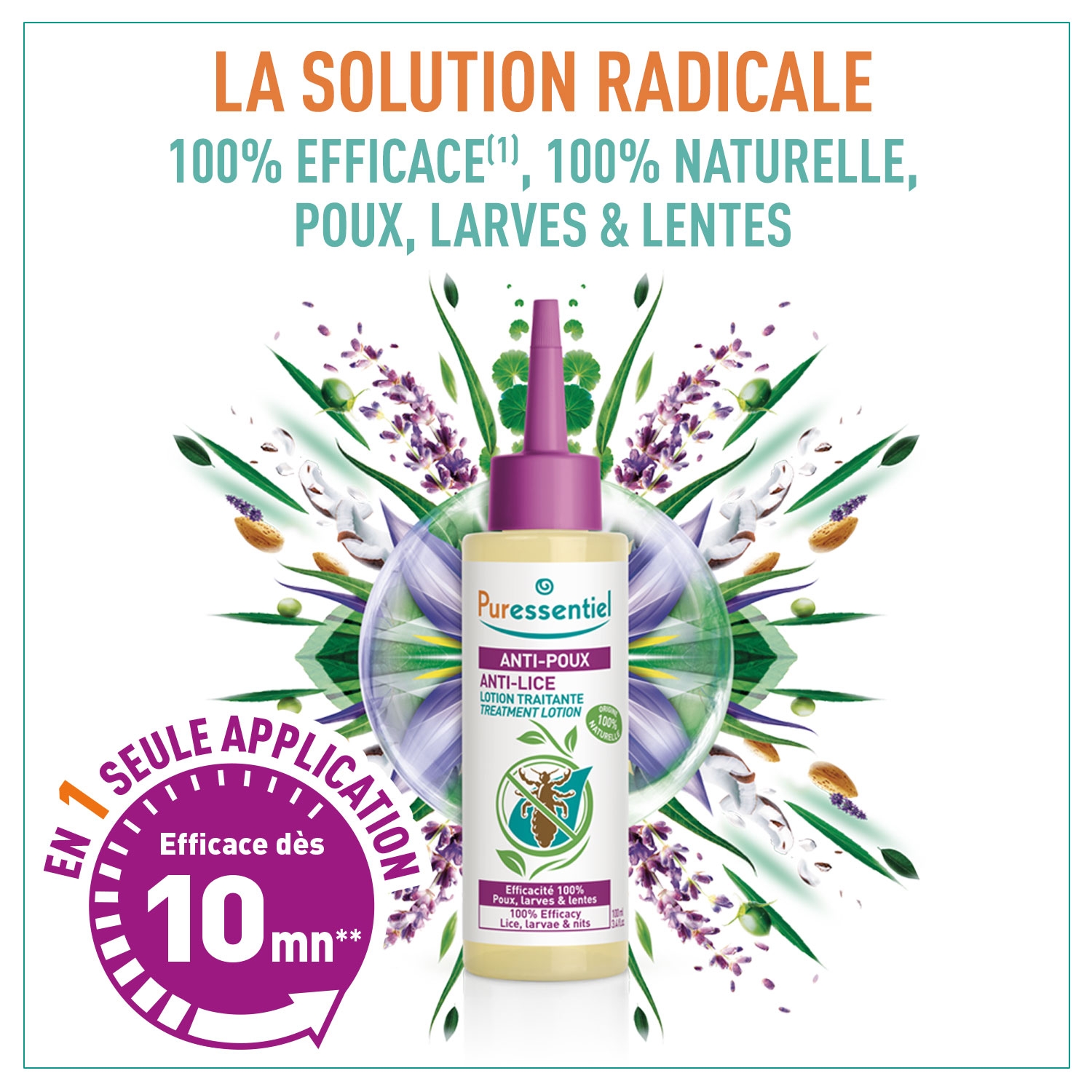 Actif dès 10 minutes(1), la lotion traitante anti-poux est efficace dès la 1ère application. Sa formule 100% naturelle sans insecticide neurotoxique associe un complexe d’Huiles Végétales asphyxiant poux, larves et lentes et des huiles essentielles, aux vertus apaisantes et antiseptiques, idéales pour calmer les démangeaisons du cuir chevelu. Facile et pratique à utiliser grâce à son flacon avec applicateur et son peigne à poux en acier, cette lotion anti-poux laisse les cheveux soyeux et brillants tout en les enveloppant d’un parfum frais et agréable.