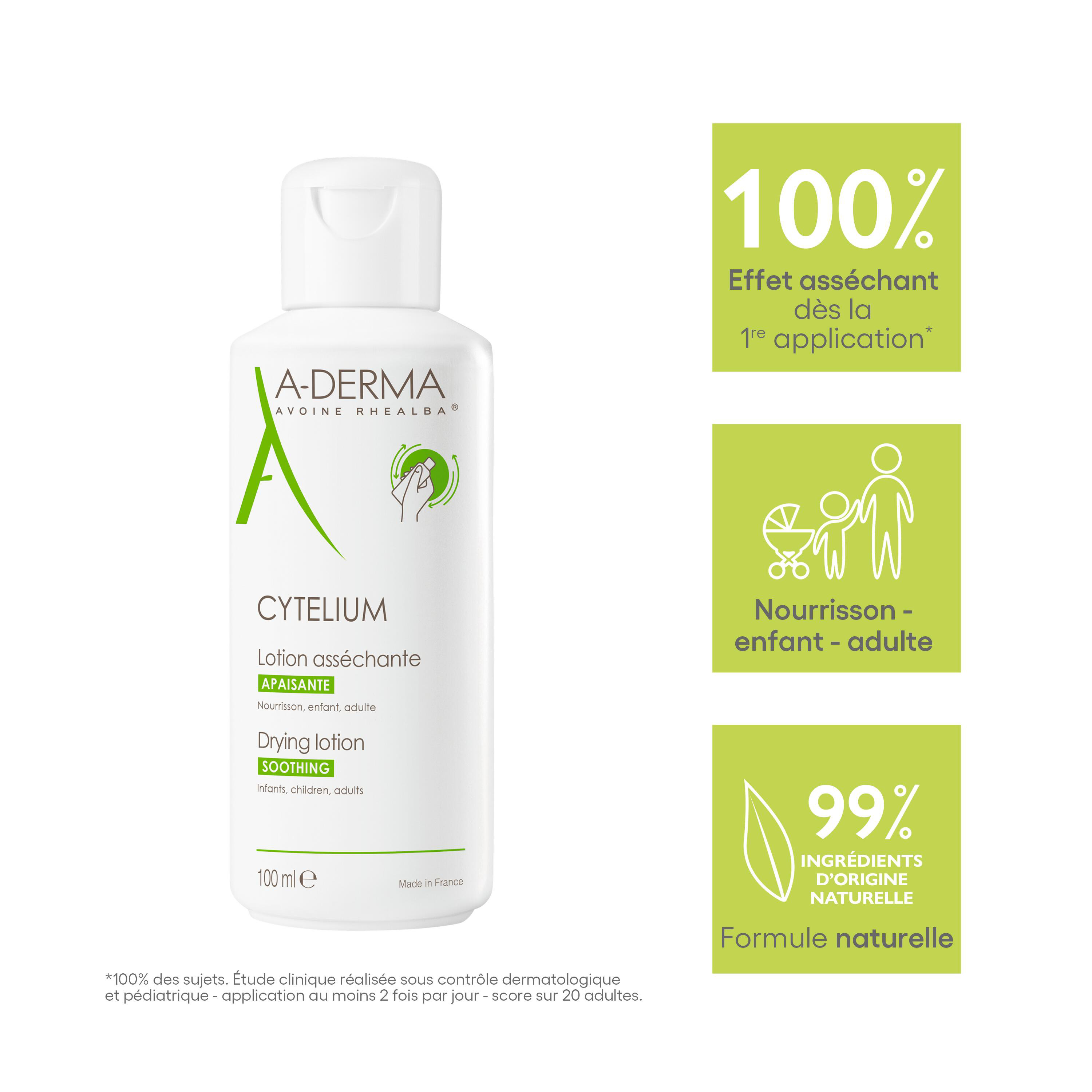 Cette lotion a la texture aqueuse et légère, composée de seulement sept ingrédients à 99 % d’origine naturelle. Elle assèche et apaise sans colorer la peau, les plis, les zones intimes externes, l’épiderme fessier et les zones fragilisées sujettes à macération, dès la première application. Une formule sans parfum, d'origine naturelle et haute tolérance adaptée à toute la famille, qui fait de CYTELIUM Lotion asséchante le plus plébiscité des produits asséchants vendus en pharmacie.* Avoine Rhealba® issu de l'agriculture biologique. Info Vegan : sans ingrédient d'origine animale. * IQVIA - Pharmatrend International - Marché 83H1 PROD. BEAUTE PR REST. PEAU en lotions et sprays - en Pharmacie en Allemagne, Autriche, Belgique, Espagne, France, Grèce, Italie, Pologne, Portugal, Slovaquie, Suisse et République Tchèque - Année 2019 - en volume et valeur. • ASSÈCHE les peaux irritées sujettes à macération. • APAISE immédiatement les zones irritées sujettes à macération. • RESPECTE la peau grâce à sa formule minimaliste, d'origine naturelle et haute tolérance. Info Vegan : sans ingrédient d'origine animale. Formule d'origine naturelle avec 7 ingrédients seulement Son Green Impact Index est A, on vous explique pourquoi. Le Green Impact index mesure l'impact environnemental et sociétal de nos produits à partir d'une note globale intégrant 20 critères. Le Green Impact Index ne mesure pas l’efficacité du produit, ni ses effets sur la santé de chacun, mais son respect de la nature et de la société dans son ensemble (éco-socio-conception). Chez Pierre Fabre, on estime qu’un produit commence à être éco-socio-conçu à partir d'une note B, même si l’objectif est à terme d’atteindre A. L’impact environnemental et sociétal de ce produit est : Emballage ne contenant pas de matière recyclée - Packaging contenant des matériaux majoritairement recyclables Formule d’origine naturelle 99%***** *****Hors gaz . Fabriqué dans une usine certifiée pour l’environnement*** Plante issue de l’agriculture biologique ***Selon la norme ISO 14001 ou ECOVADIS