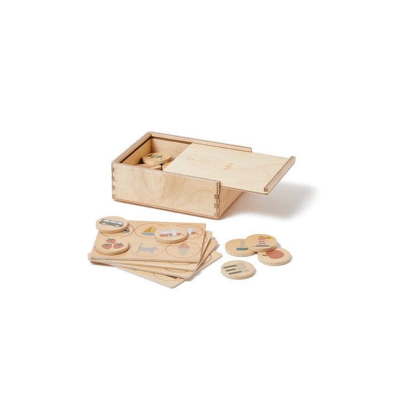 Le jeu vient dans une boîte en bois pratique avec un couvercle, facilitant le rangement et l'intégration dans votre intérieur grâce à des illustrations discrètes. Cela rend le jeu non seulement esthétique mais également facilement accessible sur l'étagère pour votre enfant.