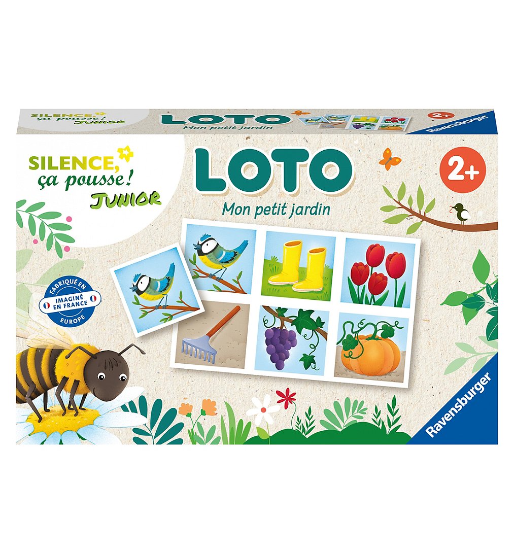 Plus produit UN GRAND CLASSIQUE : le loto est un grand classique à partir de 2 ans. Le principe d\'association d\'image permet à l\'enfant de développer sa capacité d\'observation. Ce jeu aux règles simples réunit les générations et permet de profiter du plaisir dêtre ensemble : le bonheur de jouer loin des écrans ! DE SUPERBES ILLUSTRATIONS : qui remplira sa planche en premier ? Arriveras-tu à rassembler tous ces éléments du potager ? Dans ce petit loto « Silence ça pousse » retrouve de superbes illustrations qui font la joie des petits et des grands. Chaque carte cache un élément illustrant une fleur, un fruit, un légume, un outil ou encore un petit animal. DES RÈGLES SIMPLES : chaque joueur choisit une planche. Les cartes forment une pile. Le plus jeune tire une carte, lénonce et la montre aux joueurs. Celui qui trouve limage sur sa planche la réclame et la pose au bon endroit. Si personne ne veut la carte elle retourne dans la pioche. Le gagnant est celui qui a complété sa planche le premier. CONTENU : 5 planches, 30 cartes. Ce produit est composé de matériaux issus de forêts bien gérées certifiées FSC®, de matériaux recyclés et de matériaux issus dautres sources contrôlées (FSC-C111262). Ce produit est a été imaginé en France et fabriqué en Europe. DANS LA COLLECTION : incroyable, la tomate est un fruit ! Retrouvez également Mon petit potager Silence ça pousse Junior pour découvrir des informations passionnantes sur les fruits, les légumes et les animaux du jardin tout en construisant votre potager.