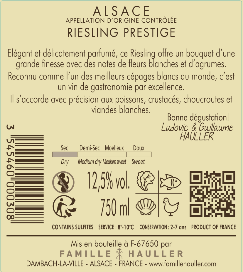 | Libellé | Louis Hauller Prestige, 2023 - Alsace Riesling AOP - Rouge - 75 cl |