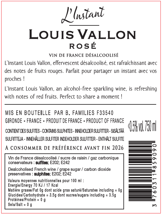 | Libellé | Louis Vallon L'Instant Rosé - effervescent désalcoolisé - 75 cl |