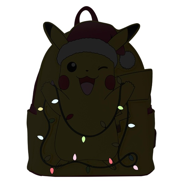 Des voeux d'hiver chaleureux pour des vacances lumineuses et brillantes ! Pikachu est prêt à se joindre à vos festivités puisqu'il apparaît sur ce mini sac à dos. Vêtu d'un chapeau rouge, il tient un faisceau de lumières colorées qui illuminent avec des éléments lumineux. Ajoutez cet accessoire à vos réjouissances pour une touche joyeuse aux traditions hivernales ! Caractéristiques : Cuir végétalien (polyuréthane) Bretelles réglables Poches latérales Quincaillerie argentée brillante Applique, lumière à fibre optique et détails imprimés Détails intérieurs coordonnés Dimensions : 9\" L x 10,5\" H x 4,5\" P Ce sac à dos est un produit Pokémon sous licence officielle.