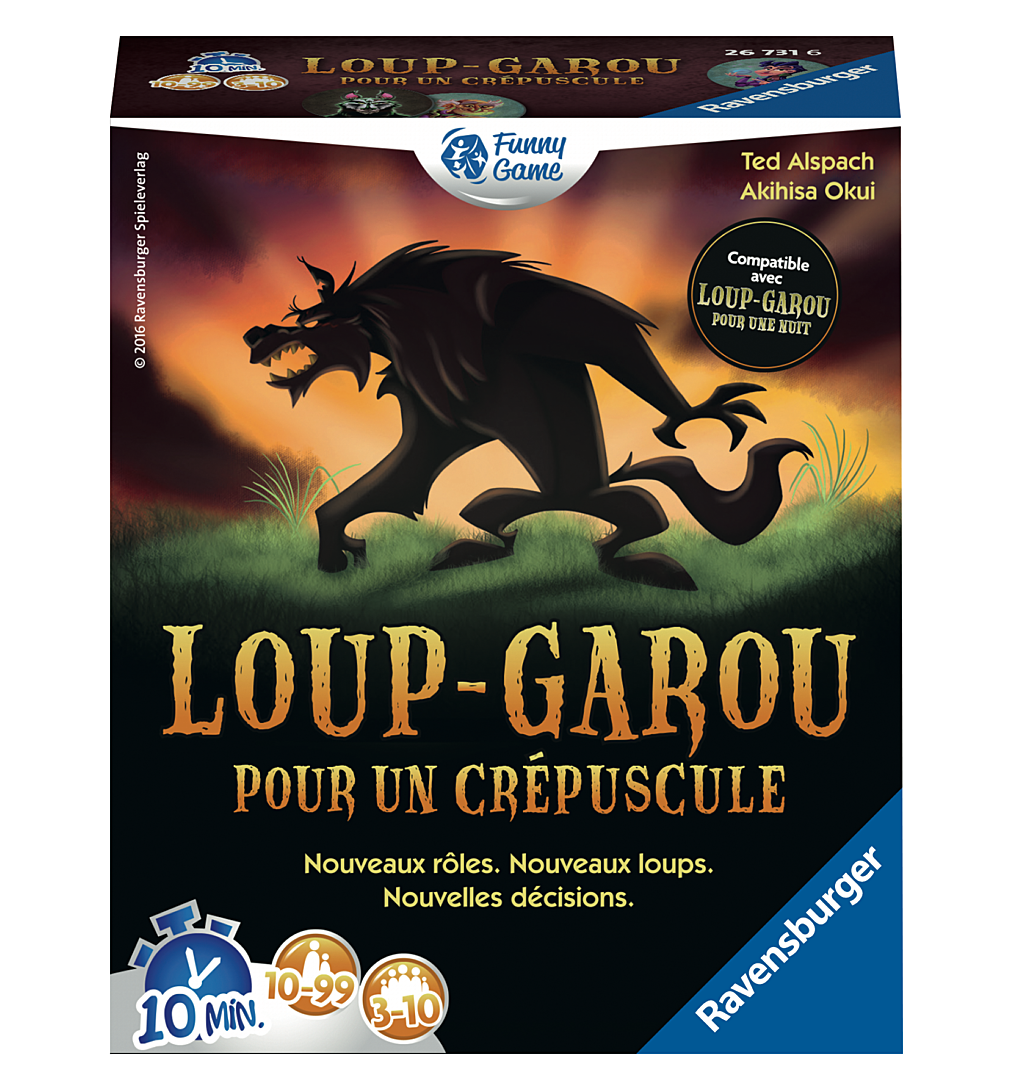 Plus produit UNE EXPERIENCE IMMERSIVE : Glissez-vous dans la peau de l\'un des douze personnages différents et soyez à laffut : Qui est un redoutable Loup-Garou ? Qui est un inoffensif villageois ? À vous de le découvrir ! LE jeu de cartes phénomène où tout est permis. DES RÈGLES SIMPLES : D\'abord, tout le monde ferme les yeux, puis les joueurs se réveillent les uns après les autres et exécutent leur compétence selon leur personnage. Puis ils discutent, bluffent et trompent les autres, pour arriver en tête du vote. Tous les coups sont permis ! Alors, saurez-vous découvrir derrière qui se cache le loup-garou ? PAS DE MAITRE DU JEU - APPLI GRATUITE : Laissez-vous bercer par la voix du maître du jeu, il vous guidera tout au long de votre nuit épique. Lancez l\'application si vous le souhaitez et c\'est parti ! Il ne vous reste plus qu\'à démasquer les loups-garous présents dans vos rangs ! Une nuit, Une décision, et donc des parties courtes de 10 min ! DES PARTIES RAPIDES & INTENSES : Loup-Garou pour un Crépuscule est jouable à partir de 3 joueurs et sans élimination directe ! Tout le monde joue jusqu\'au bout, de quoi profiter de la nuit entière pour échaffauder vos meilleures ruses ! Grâce au changement des rôles à chaque partie, profitez d\'une très grande rejouabilité. " CONTENU : 16 cartes personnages, 16 jetons, une règle du jeu. A partir de 8 ans. Une partie dure en moyenne 10 minutes. Peut être combiné avec les autres jeux de la gamme : Vampire pour une Nuit, ou Loup Garou Pour une Nuit. Chaque boîte contient des personnages différents, avec des pouvoirs inédits. Existe aussi le coffret Best-of !"