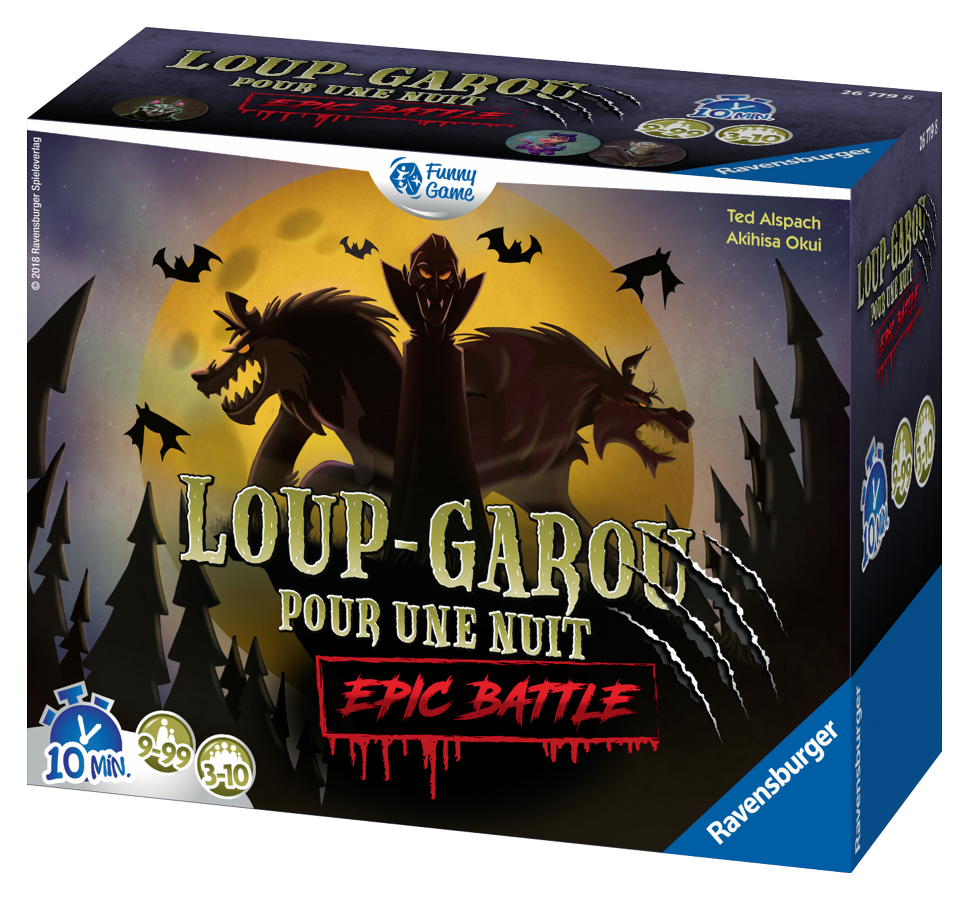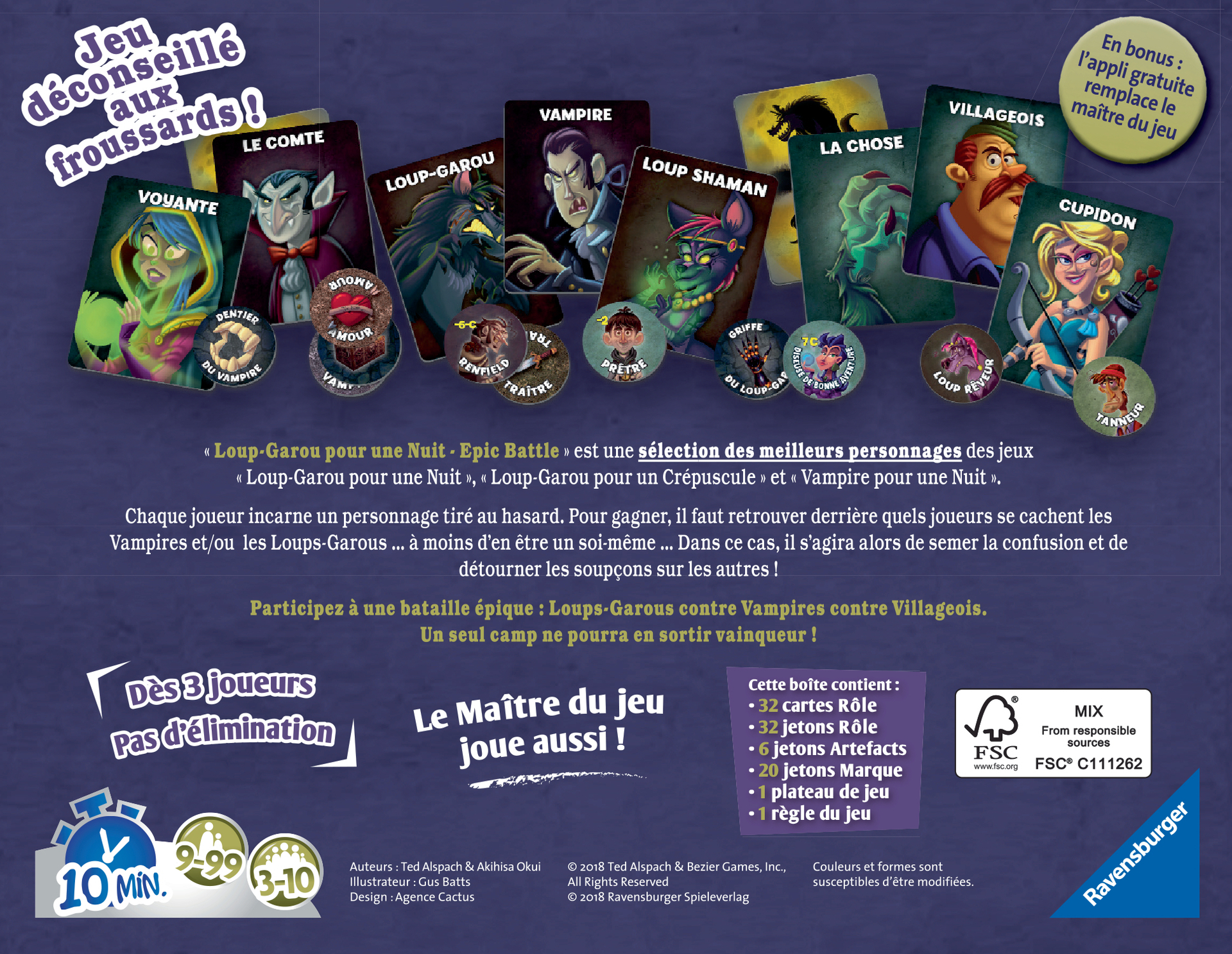 Vous savez feinter et manipuler d'une main de Maître ? Vous pensez que personne ne peut rien contre vous ?Alors vous avez frappé à la bonne porte !Le soleil vient de se coucher. Vampires et Loups-garou chassent dans le village endormi, mais très vite tout dérape !Heureusement certains villageois sont dotés de capacités hors du commun !Glissez dans la peau de l'un des 30 personnages et soyez à l'affût !Mais qui est un honnête villageois et qui est un terrible Loup Garou ou un Vampire aux dents longues ? À vous de le découvrir ! Epic Battle pack regroupe les 30 meilleurs personnages de Loup Garou pour Une Nuit, Loup Garou pour un Crépuscule et Vampire pour Une Nuit !Vous êtes désormais prêt pour un affrontement de bluff entre créatures mystiques !Également adapté aux petits groupes, pas d'élimination, le Maître du jeu joue aussi En bonus : l'appli gratuite remplace le Maître du jeu !Dès 9 ans.