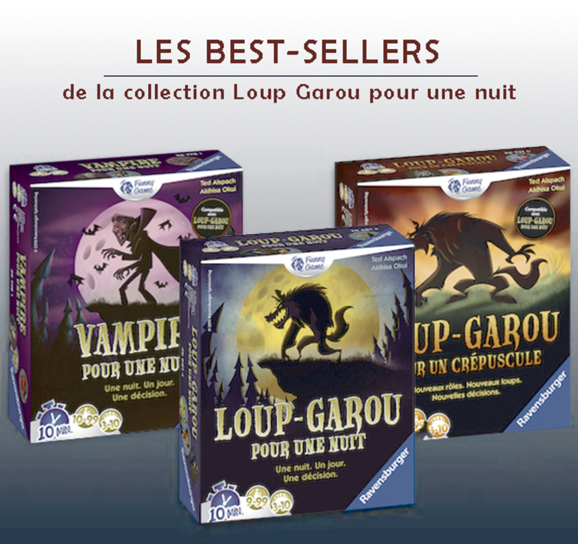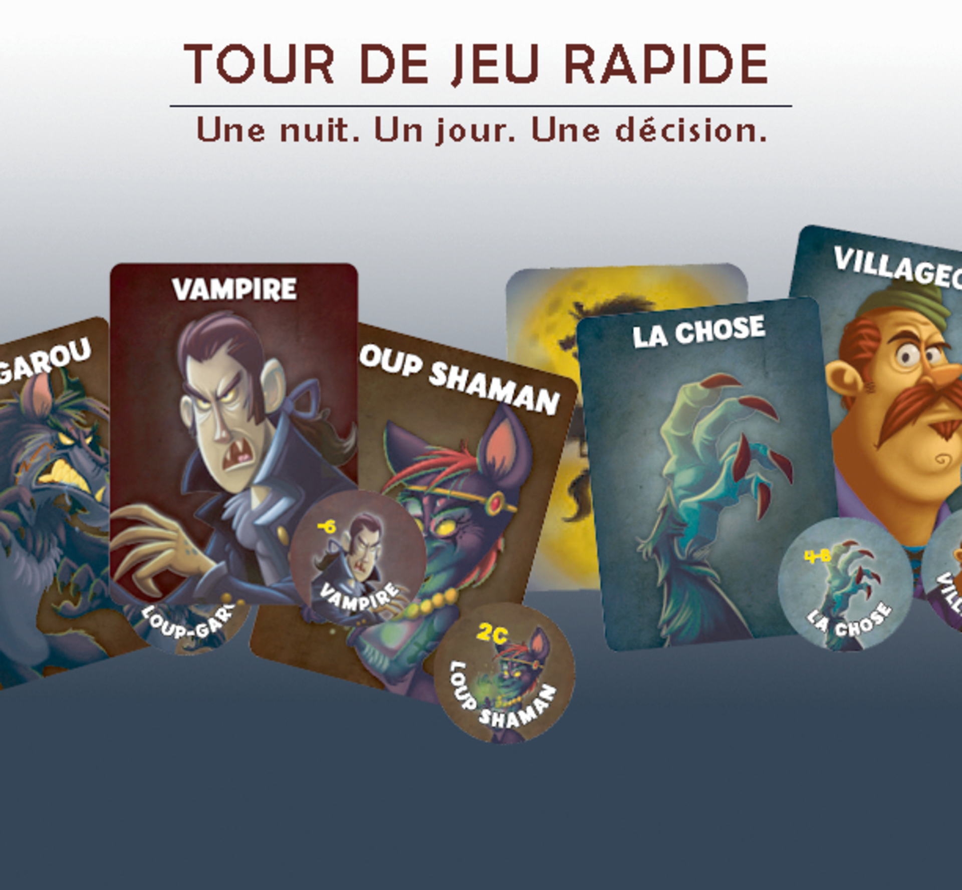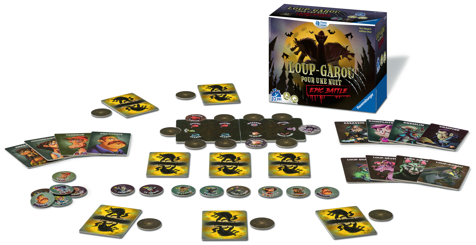 Plus produit UNE EXPERIENCE IMMERSIVE : Le soleil vient de se coucher. Vampires et Loups-garou chassent dans le village endormi, mais très vite tout dérape ! Glissez dans la peau de l\'un des 30 personnages et soyez à l\'affût ! Mais qui est un honnête villageois et qui est un terrible Loup Garou ou un Vampire aux dents longues ? À vous de le découvrir ! BLUFF & AMBIANCE spécial PETITS GROUPES : Loup-Garou pour une Nuit est jouable à partir de 3 joueurs et sans élimination directe ! Tout le monde joue jusqu\'au bout, de quoi profiter de la nuit entière pour échaffauder vos meilleures ruses ! Des parties rapides de 10 min. qui permet de changer de rôle à chaque fois ! Grande rejouabilité. PAS DE MAITRE DU JEU - APPLI GRATUITE : Laissez-vous bercer par la voix du maître du jeu, il vous guidera tout au long de votre nuit épique. Lancez l\'application si vous le souhaitez et c\'est parti ! Il ne vous reste plus qu\'à démasquer les loups-garous présents dans vos rangs ! COFFRET BEST-OF : Epic Battle pack regroupe les 30 meilleurs personnages de 3 jeux épiques Loup Garou pour Une Nuit, Loup Garou pour un Crépuscule et Vampire pour Une Nuit ! Vous êtes désormais prêt pour un affrontement de bluff entre créatures mystiques ! CONTENU : 31 cartes rôles, 31 jetons rôles, 19 jetons Marque, 6 jetons artefacts, 2 jetons votes, 1 règle du jeu. En bonus : l\'appli gratuite remplace le maître du jeu. Découvrez aussi Loup garou pour une Nuit version Harry Potter, ou encore une édition avec des vampires !