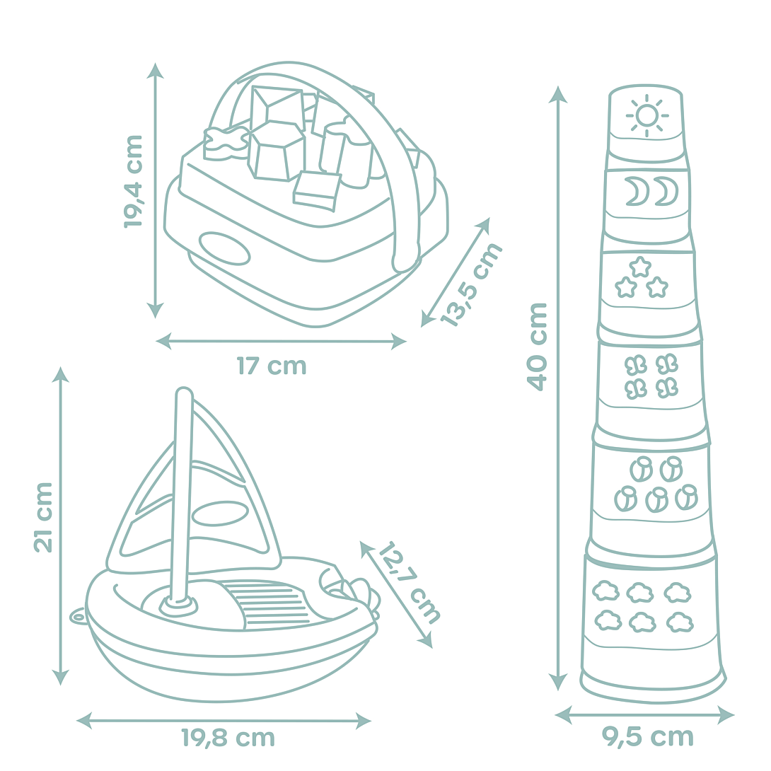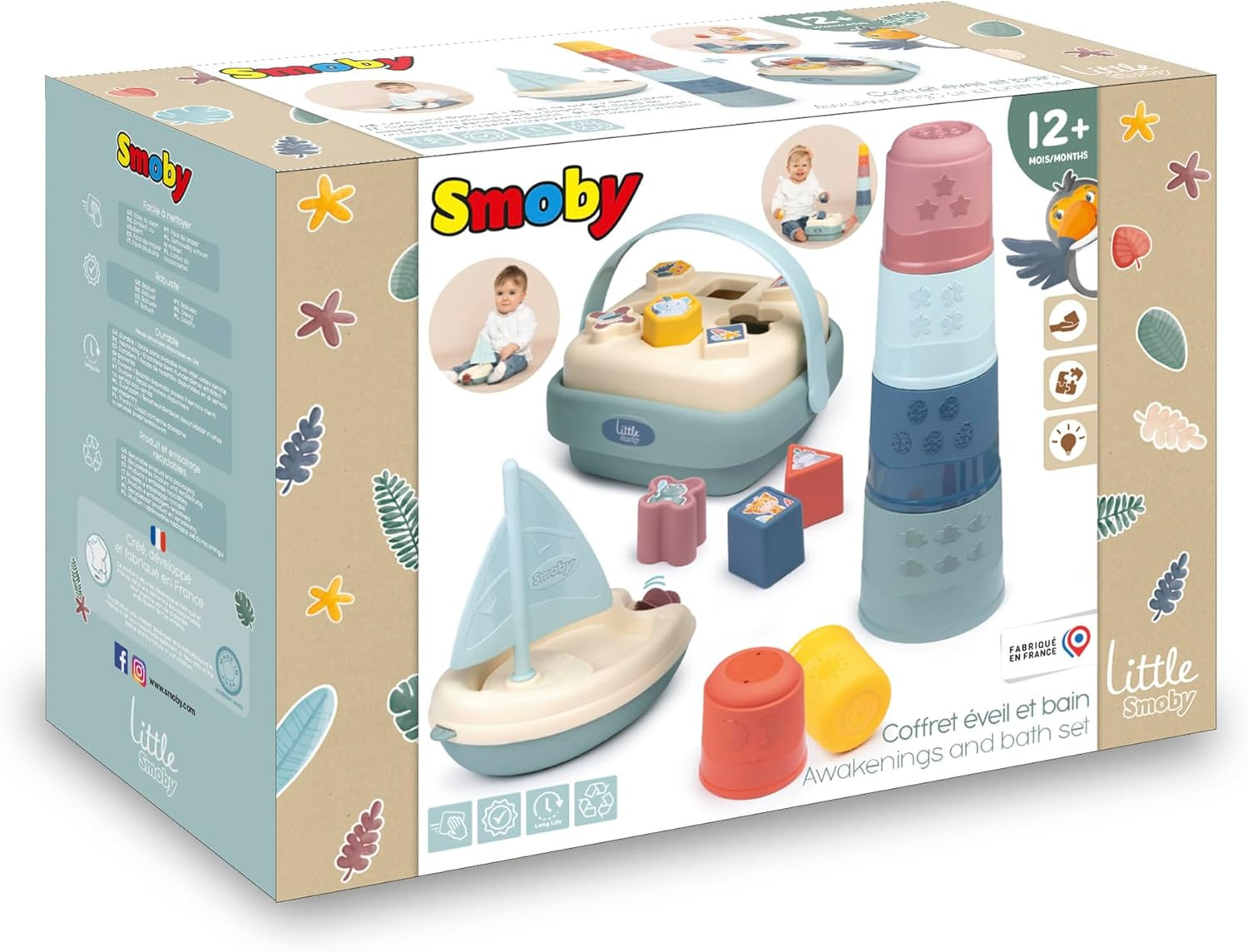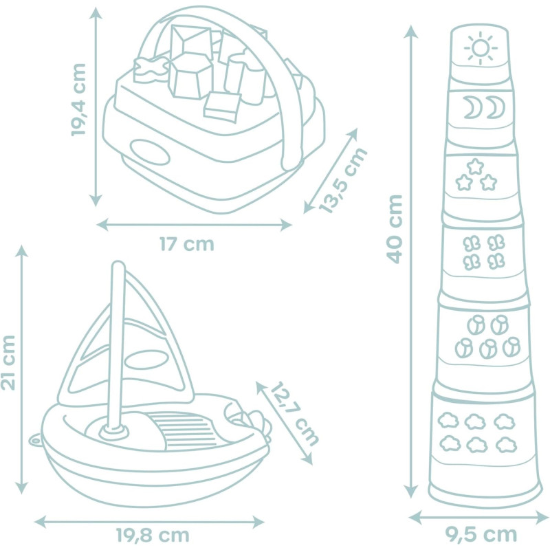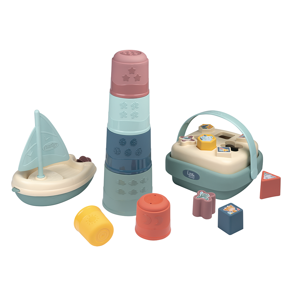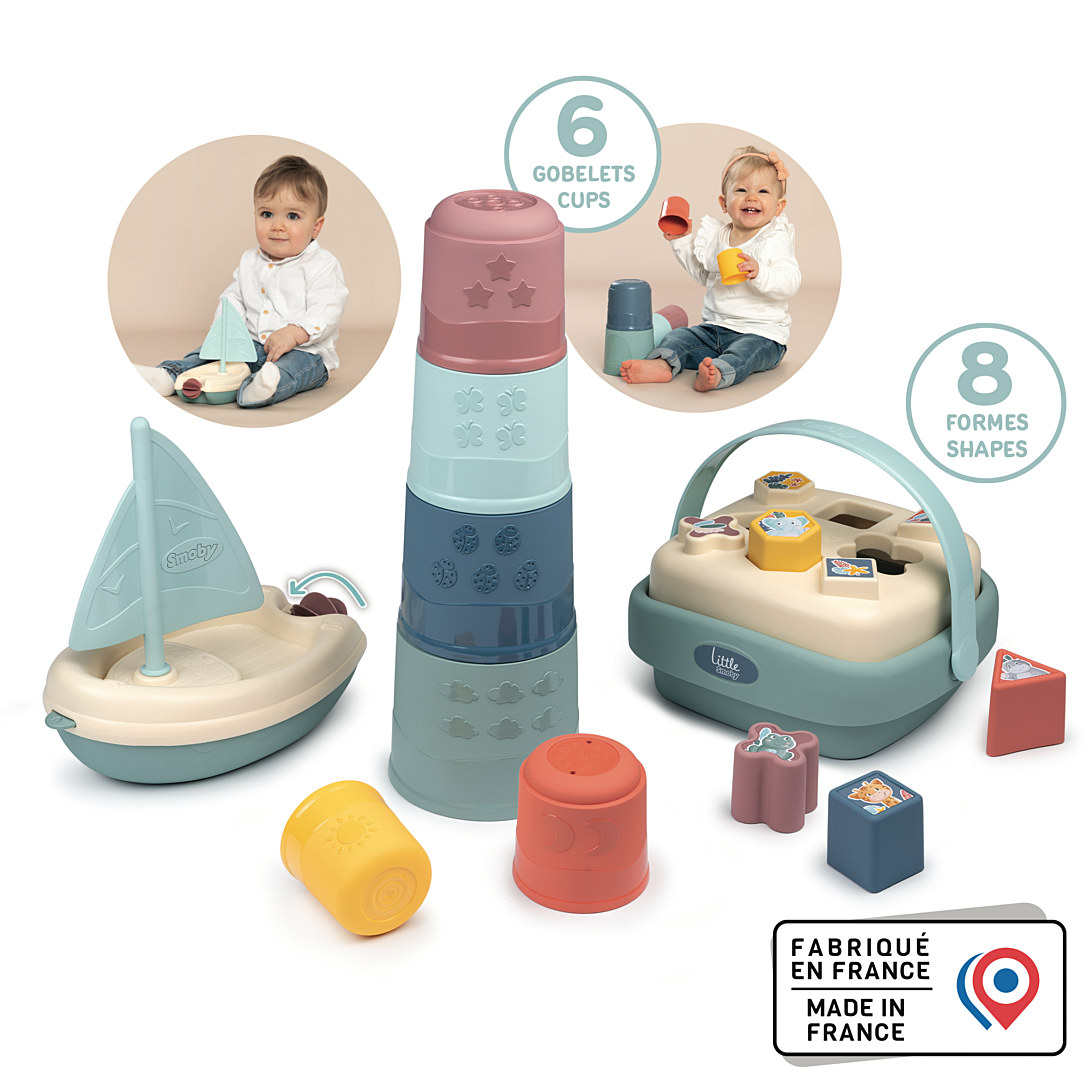 Grâce au joli coffret éveil et bain Little Smoby, l'enfant pourra développer sa reconnaissance des formes et des couleurs tout en travaillant sa motricité! Composé d'une magic tower, d'un panier des formes et d'un bateau à voile, c'est un cadeau idéal pour les enfants à partir de 12 mois. Facile à prendre en main, bébé s'amusera à manipuler et empiler les 6 gobelets. Hauteur de la tour : 40cm. Le trieur de formes est composé de 8 formes (carrés, triangles, hexagones, ...) à encastrer ou à empiler. En plus, grâce à sa poignée, bébé pourra se déplacer partout avec son panier ! Le bateau à voile animera l'heure du bain avec sa voile et sa roue à aubes. A partir de 12 mois. Fabrication française.