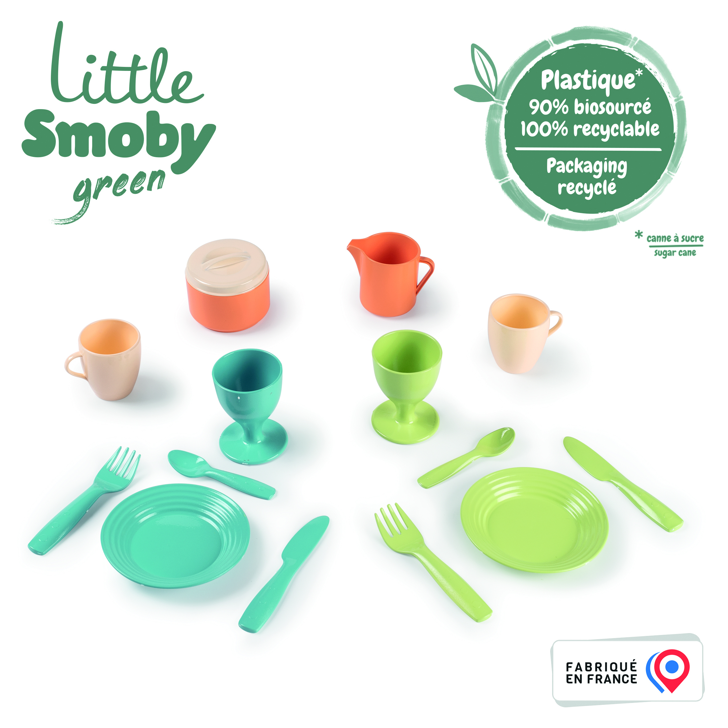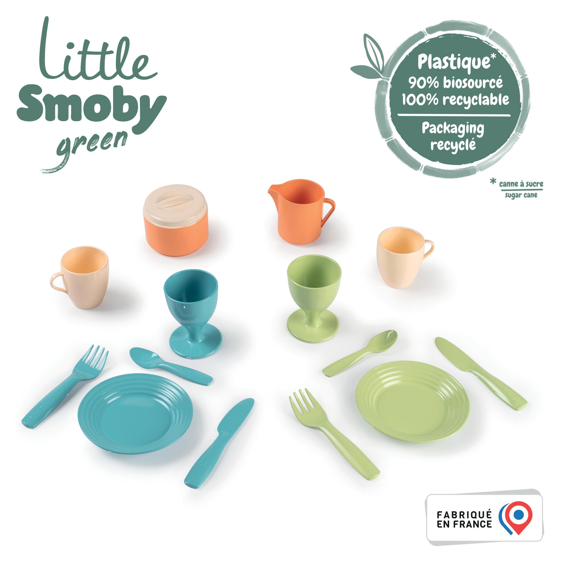 Dinette Little Smoby Green composée de 2 tasses, 2 verres à pied, 2 assiettes, 2 fourchettes, 2 couteaux, 2 cuillères, 1 pot à lait, et 1 sucrier